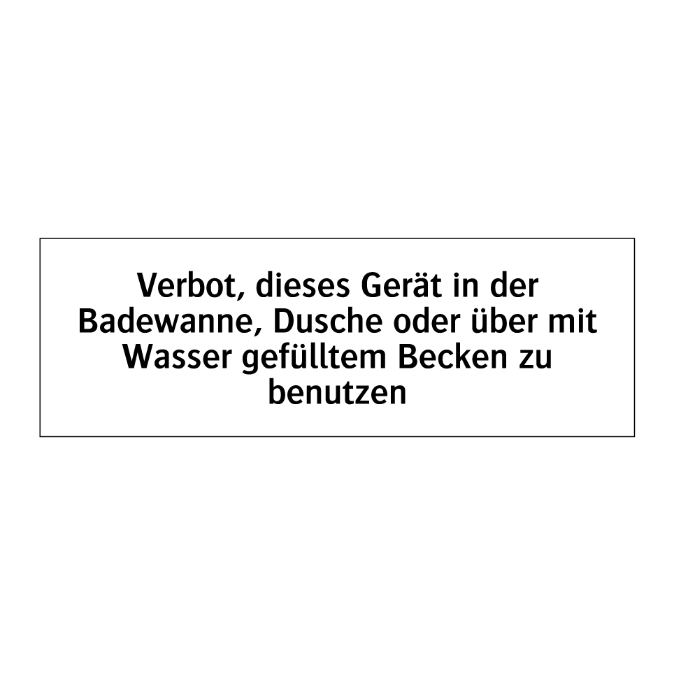 Verbotsschild mit dem Text Verbot, dieses Gerät in der Badewanne, Dusche oder über mit Wasser gefülltem Becken zu benutzen
