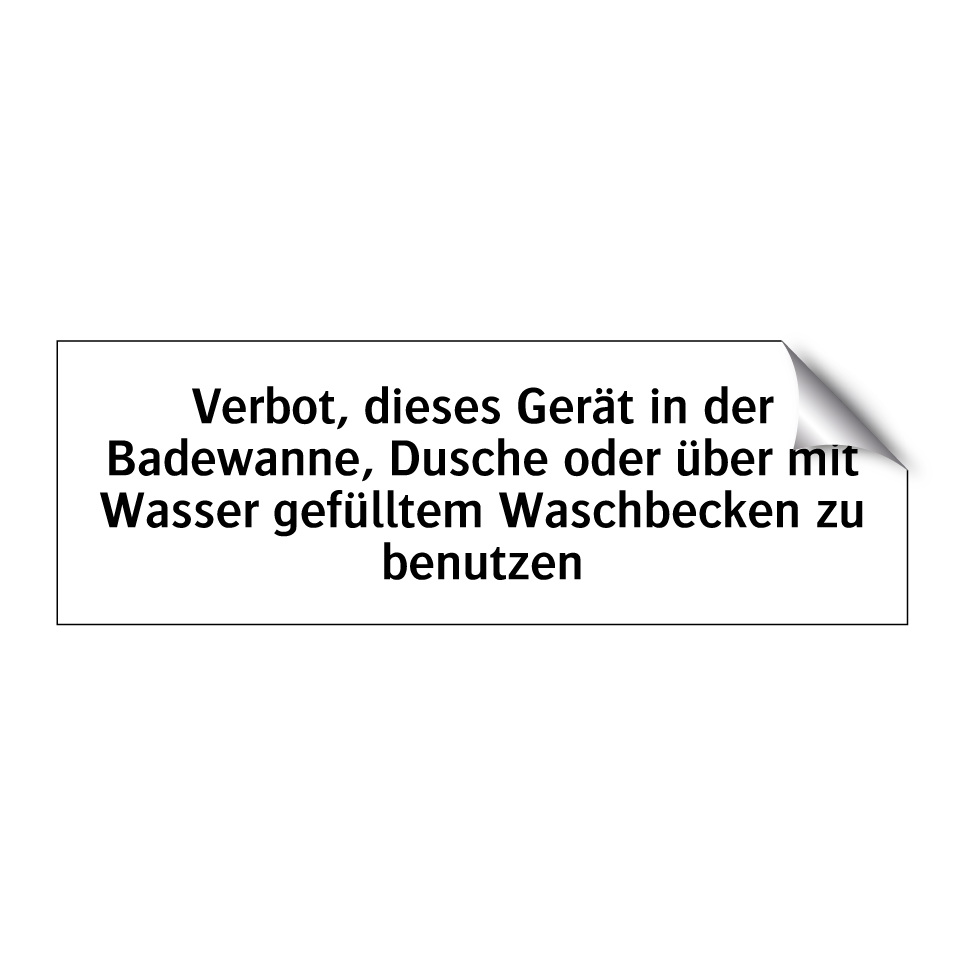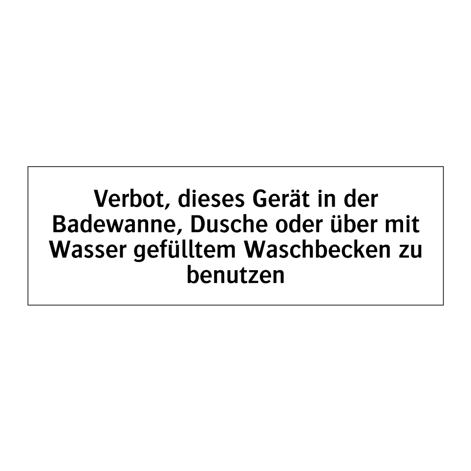 Verbotsschild mit dem Text Verbot, dieses Gerät in der Badewanne, Dusche oder über mit Wasser gefülltem Waschbecken zu benutzen