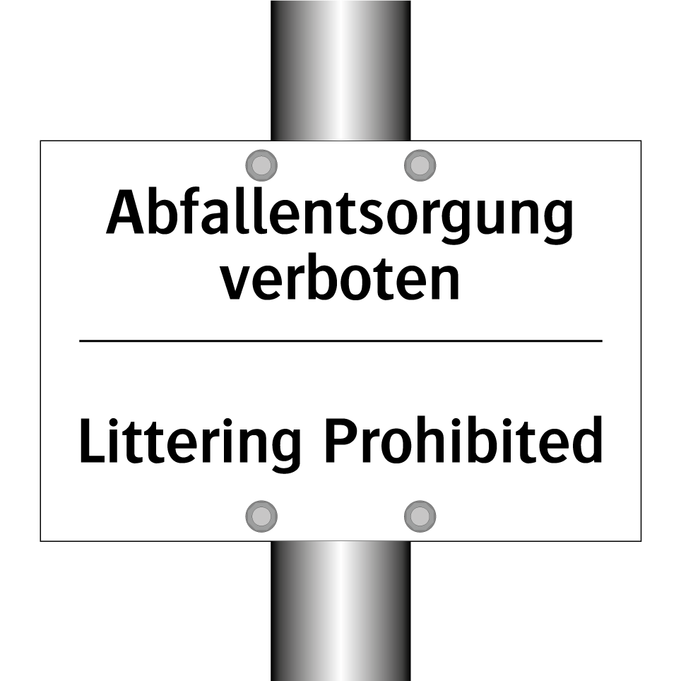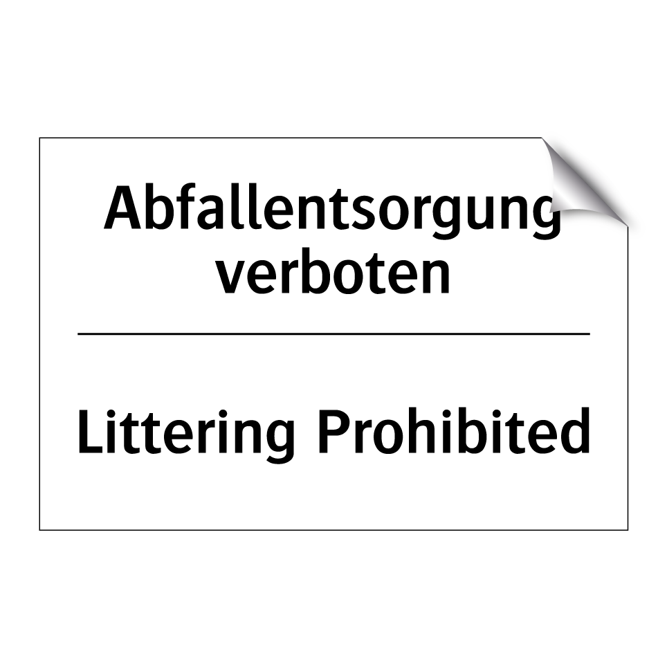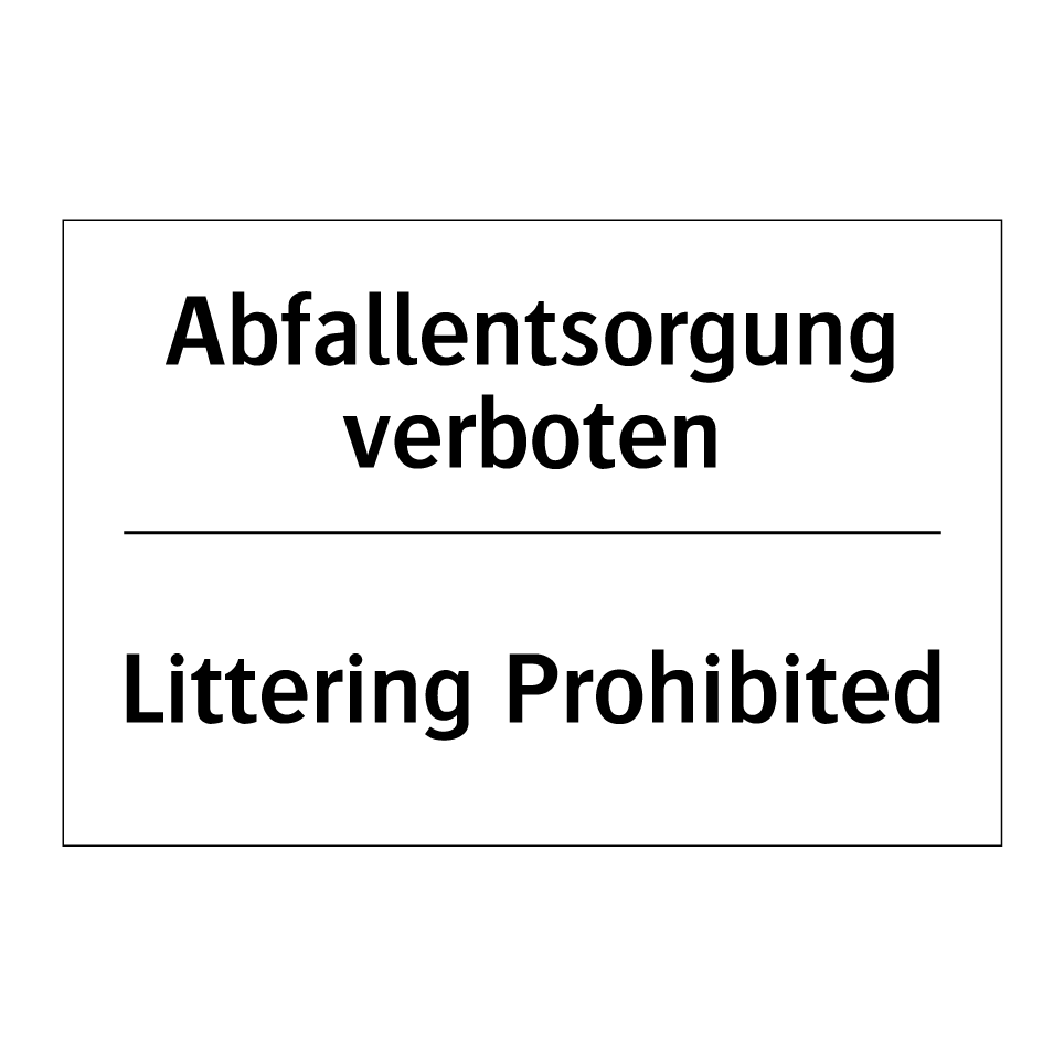 Zweisprachiges Verbotsschild mit deutschem Text Abfallentsorgung verboten und englischem Text Littering Prohibited