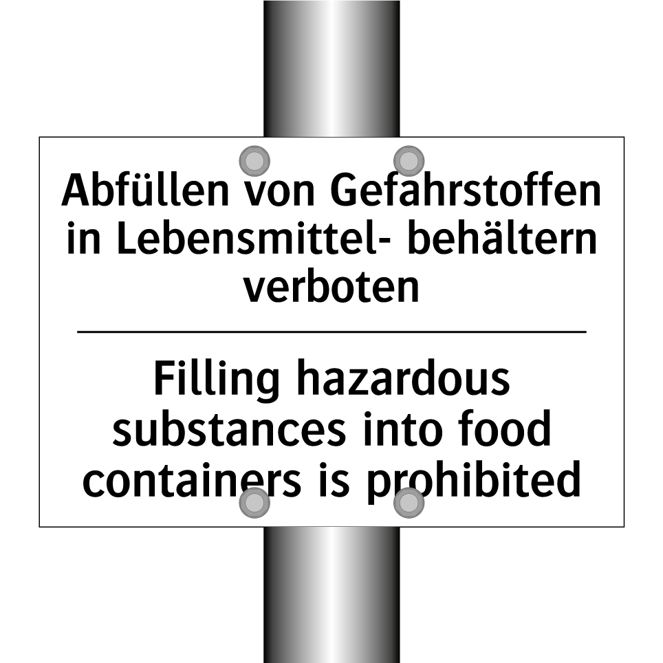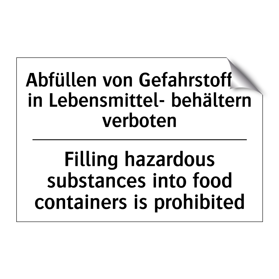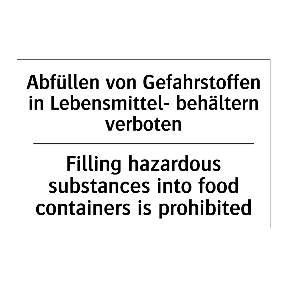 Zweisprachiges Verbotsschild mit deutschem Text Abfüllen von Gefahrstoffen in Lebensmittel- behältern verboten und englischem Text Filling hazardous substances into food containers is prohibited