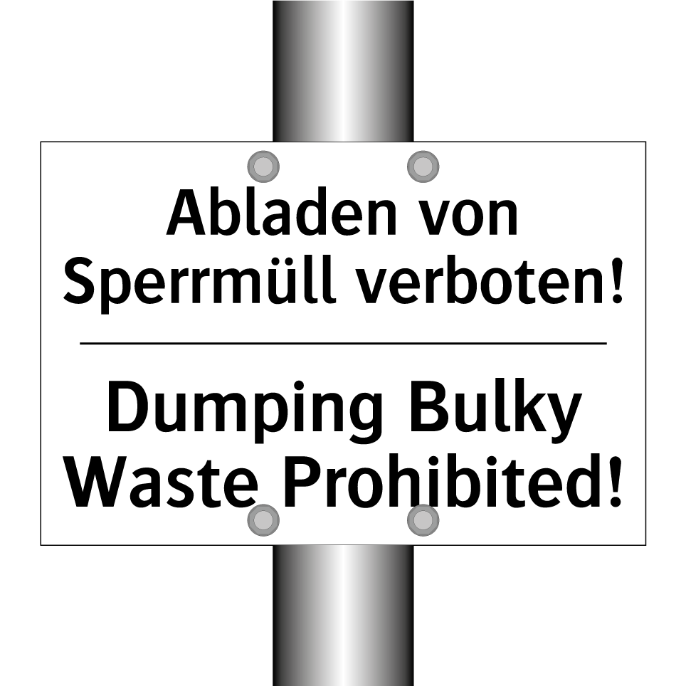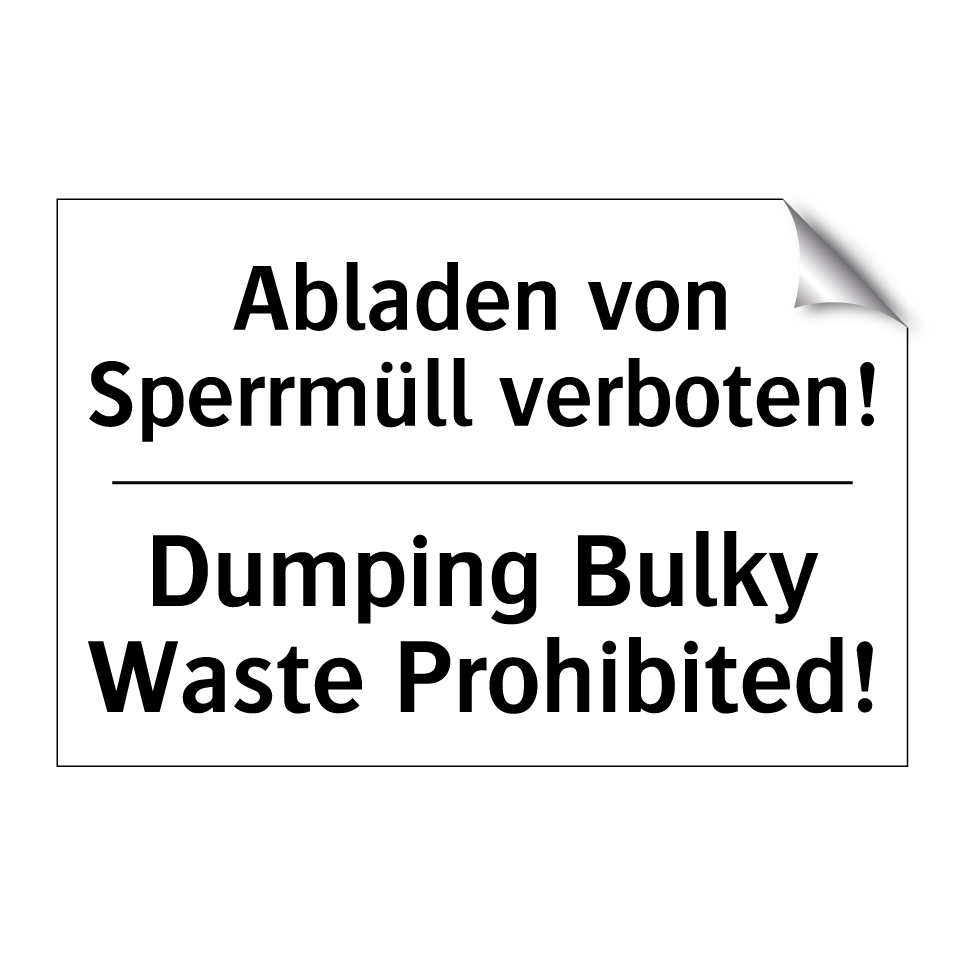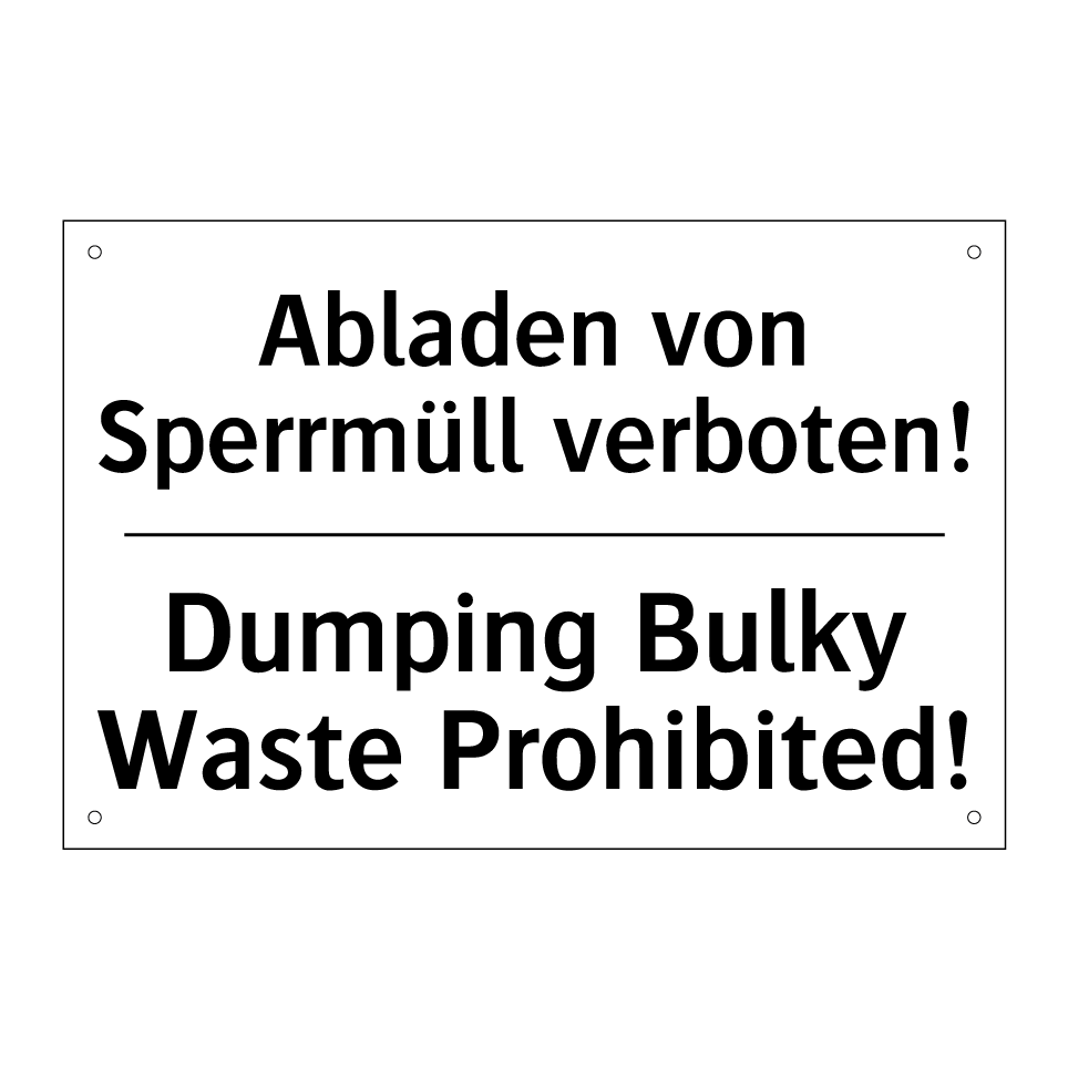 Zweisprachiges Verbotsschild mit deutschem Text Abladen von Sperrmüll verboten! und englischem Text Dumping Bulky Waste Prohibited!
