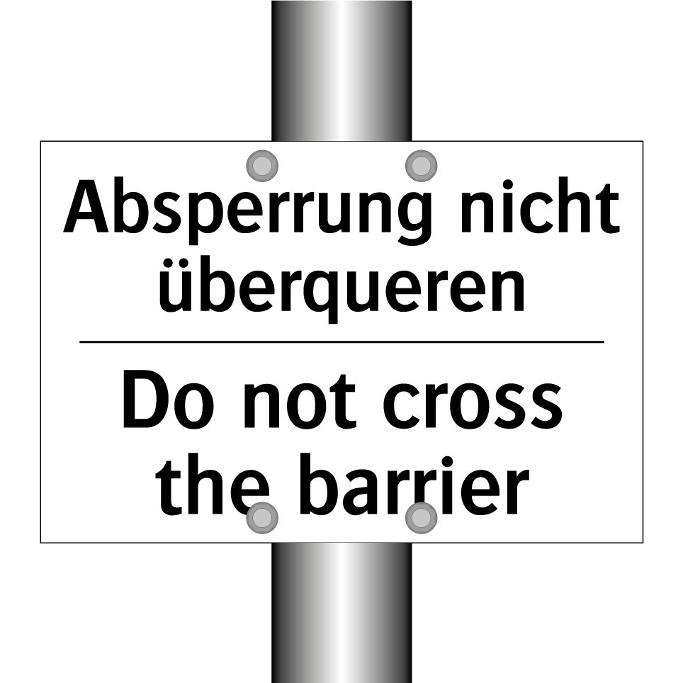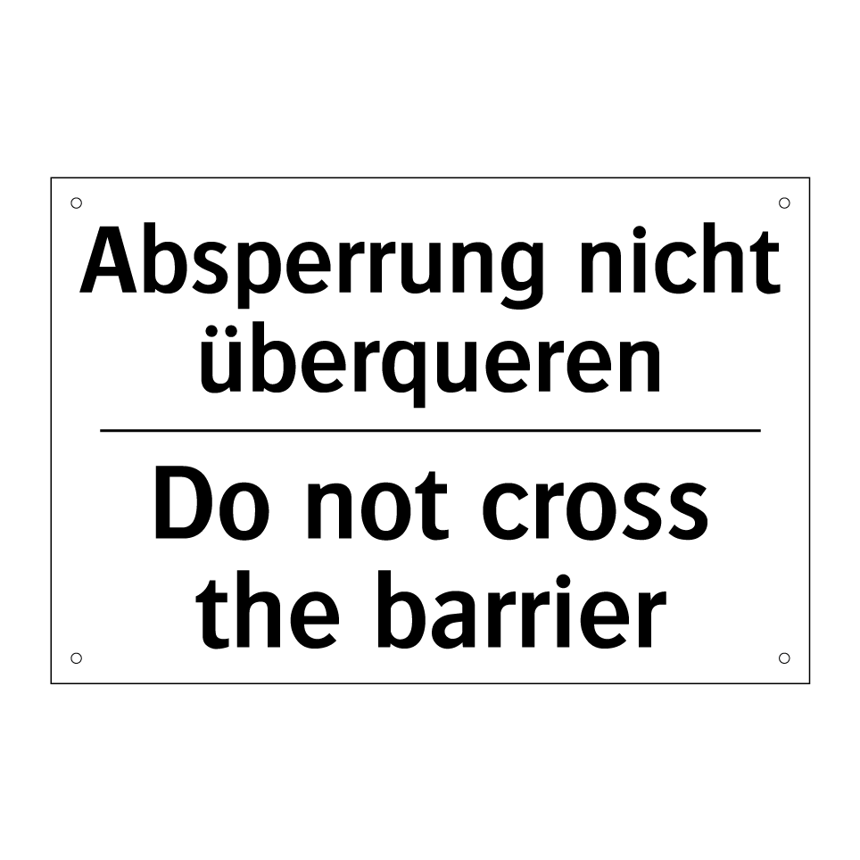 Zweisprachiges Verbotsschild mit deutschem Text Absperrung nicht überqueren und englischem Text Do not cross the barrier