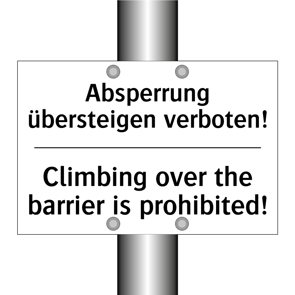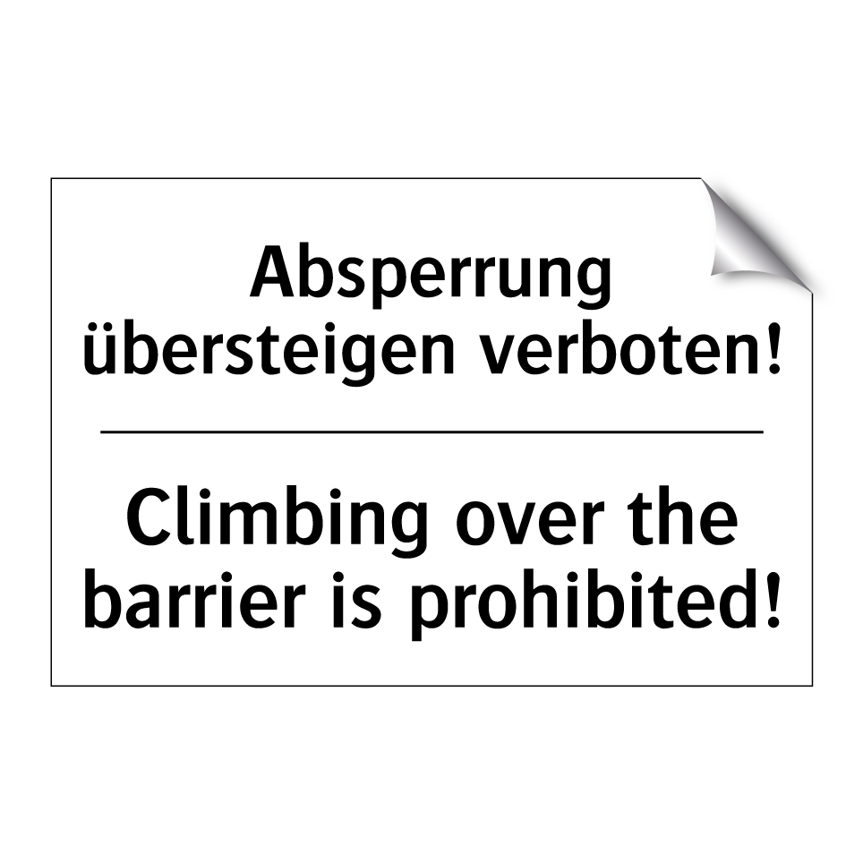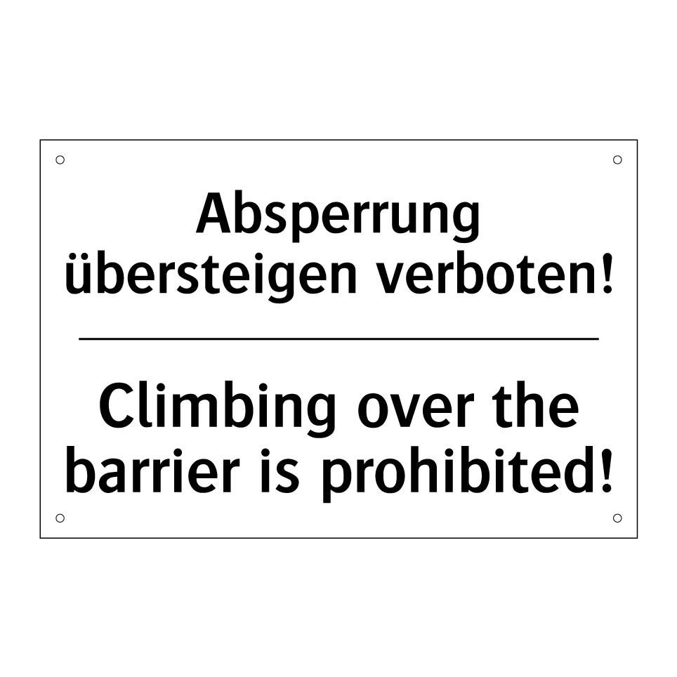 Zweisprachiges Verbotsschild mit deutschem Text Absperrung übersteigen verboten! und englischem Text Climbing over the barrier is prohibited!