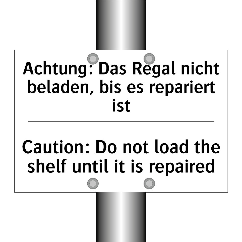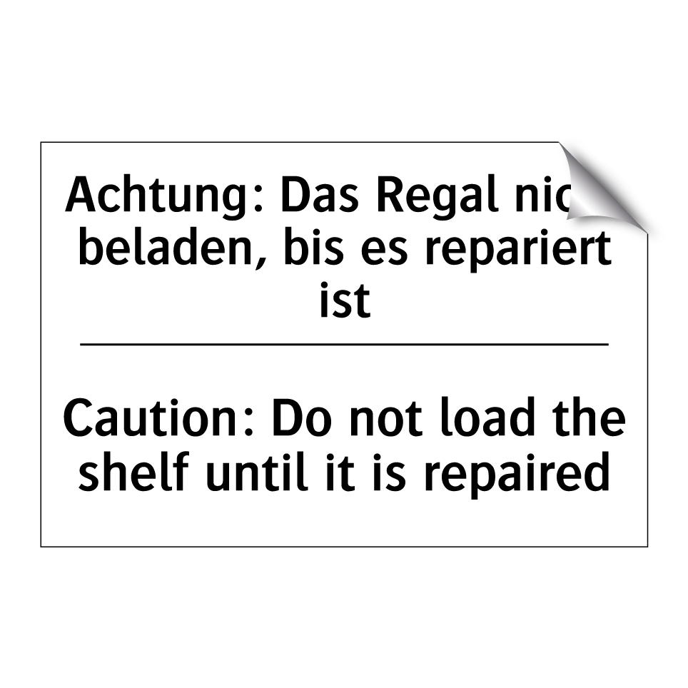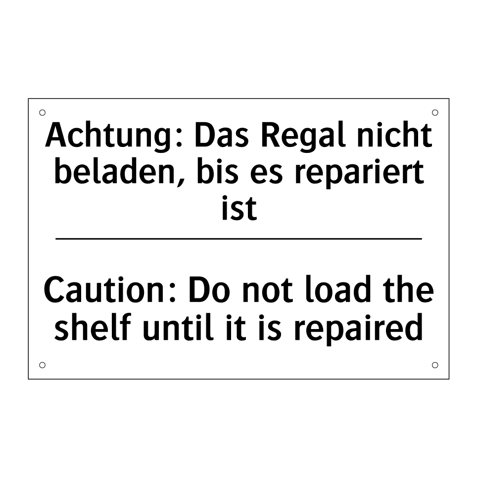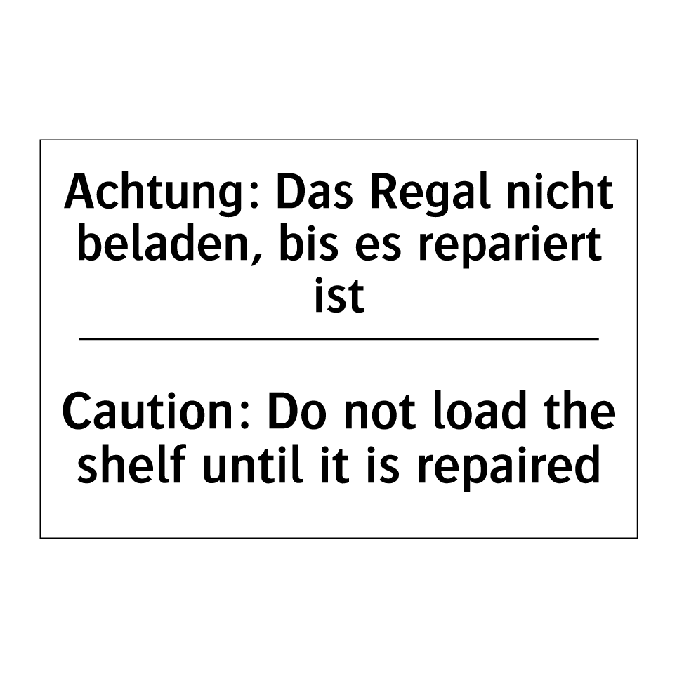 Zweisprachiges Verbotsschild mit deutschem Text Achtung: Das Regal nicht beladen, bis es repariert ist und englischem Text Caution: Do not load the shelf until it is repaired