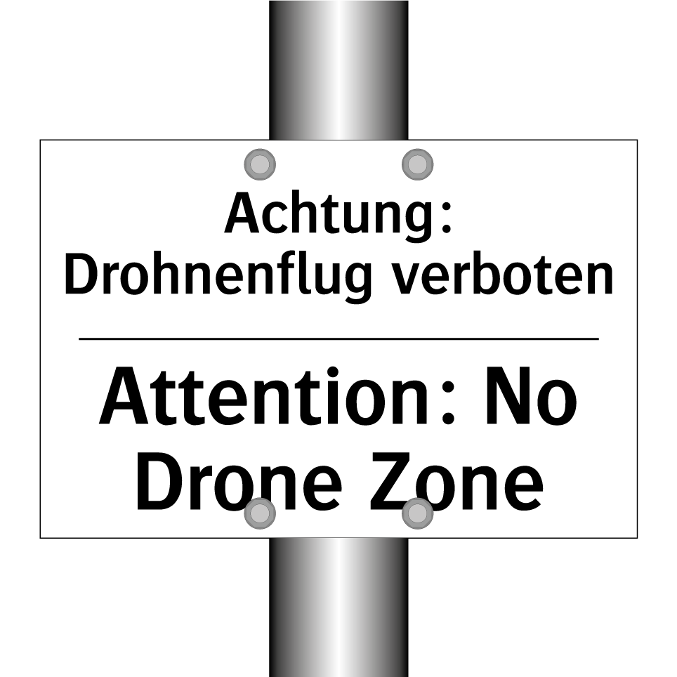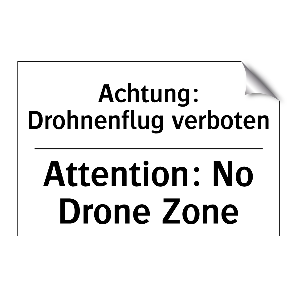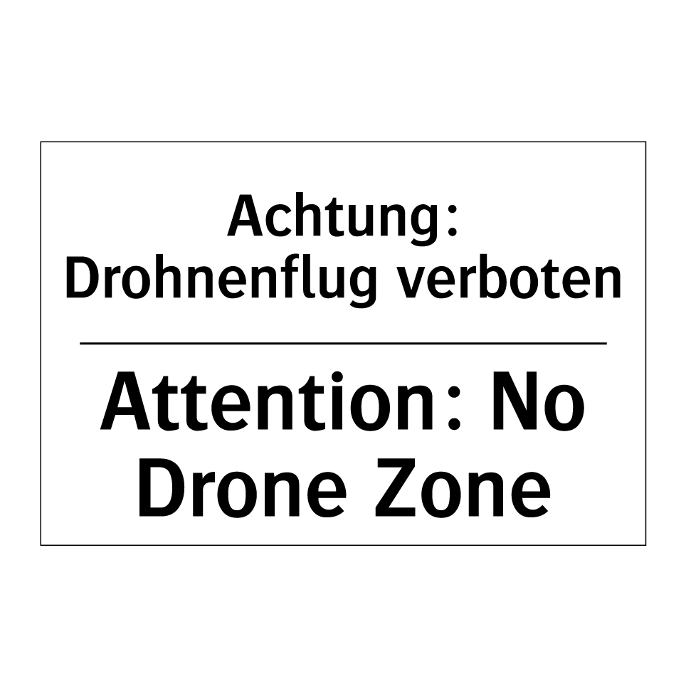 Zweisprachiges Verbotsschild mit deutschem Text Achtung: Drohnenflug verboten und englischem Text Attention: No Drone Zone