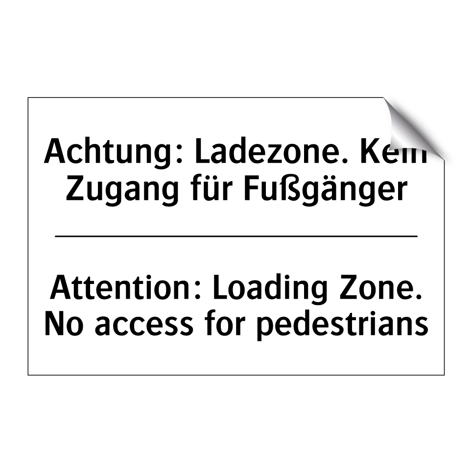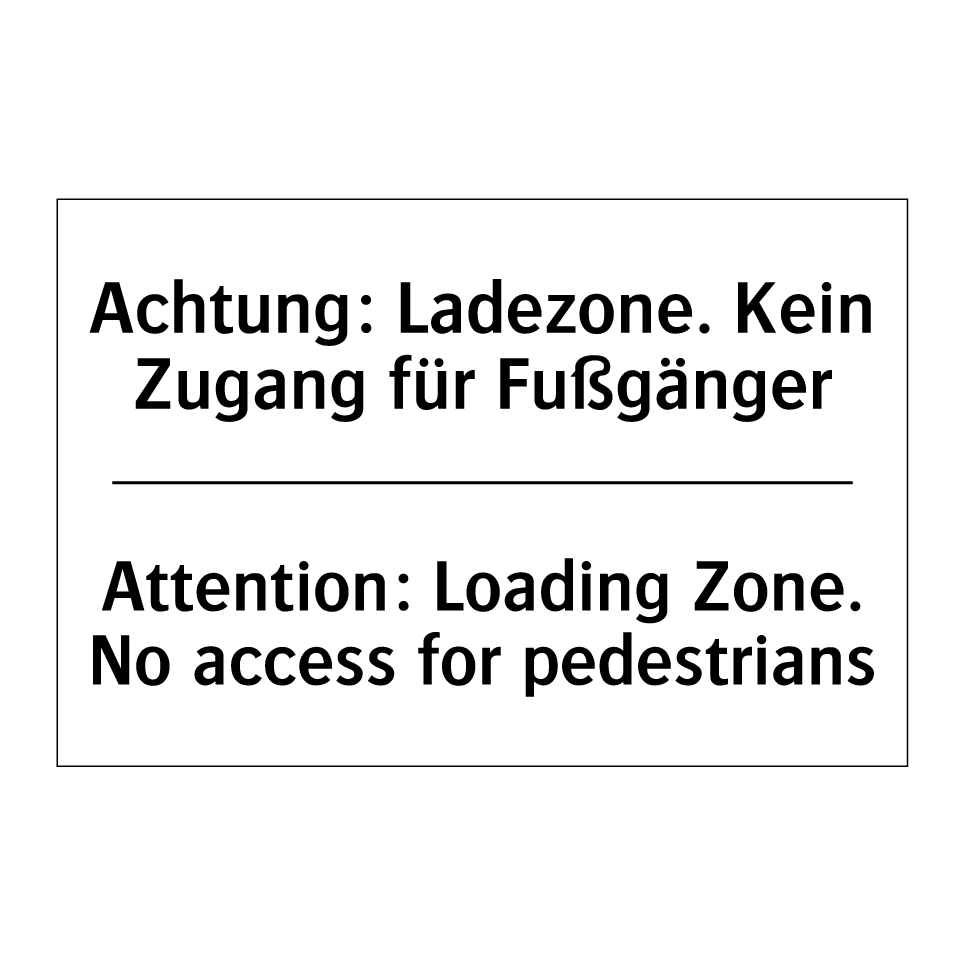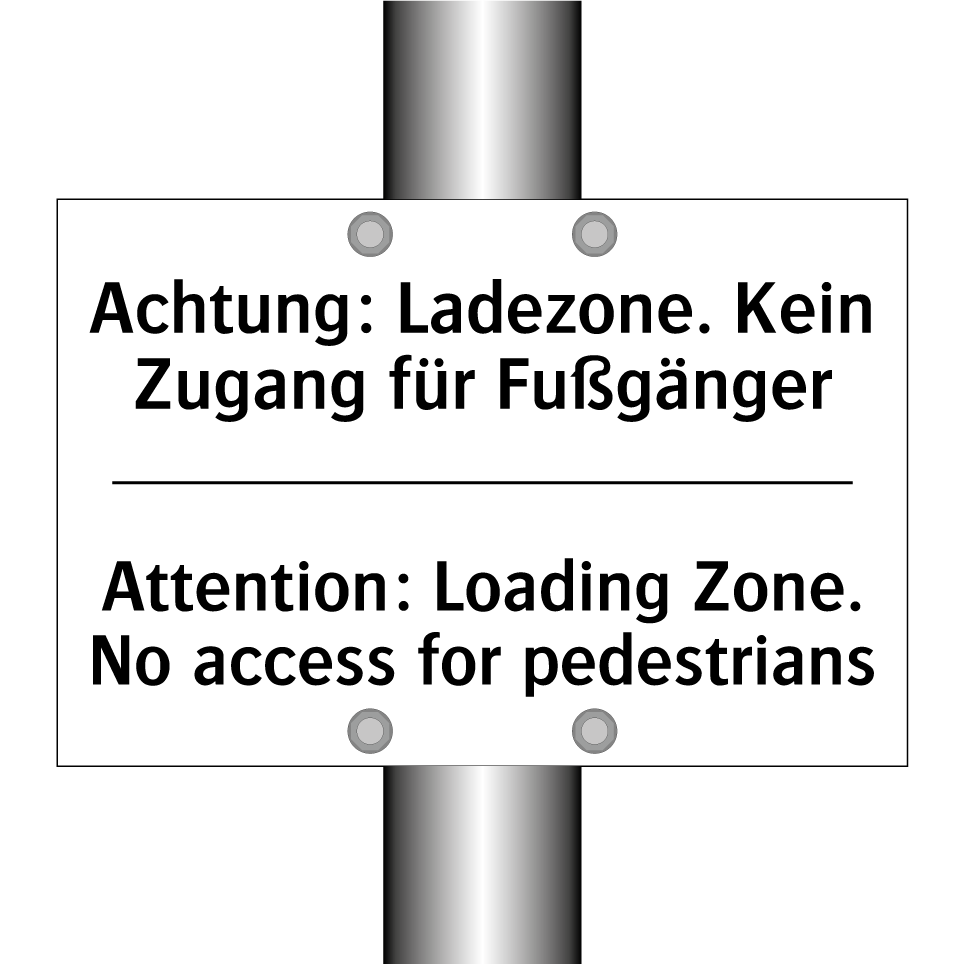 Zweisprachiges Verbotsschild mit deutschem Text Achtung: Ladezone. Kein Zugang für Fußgänger und englischem Text Attention: Loading Zone. No access for pedestrians