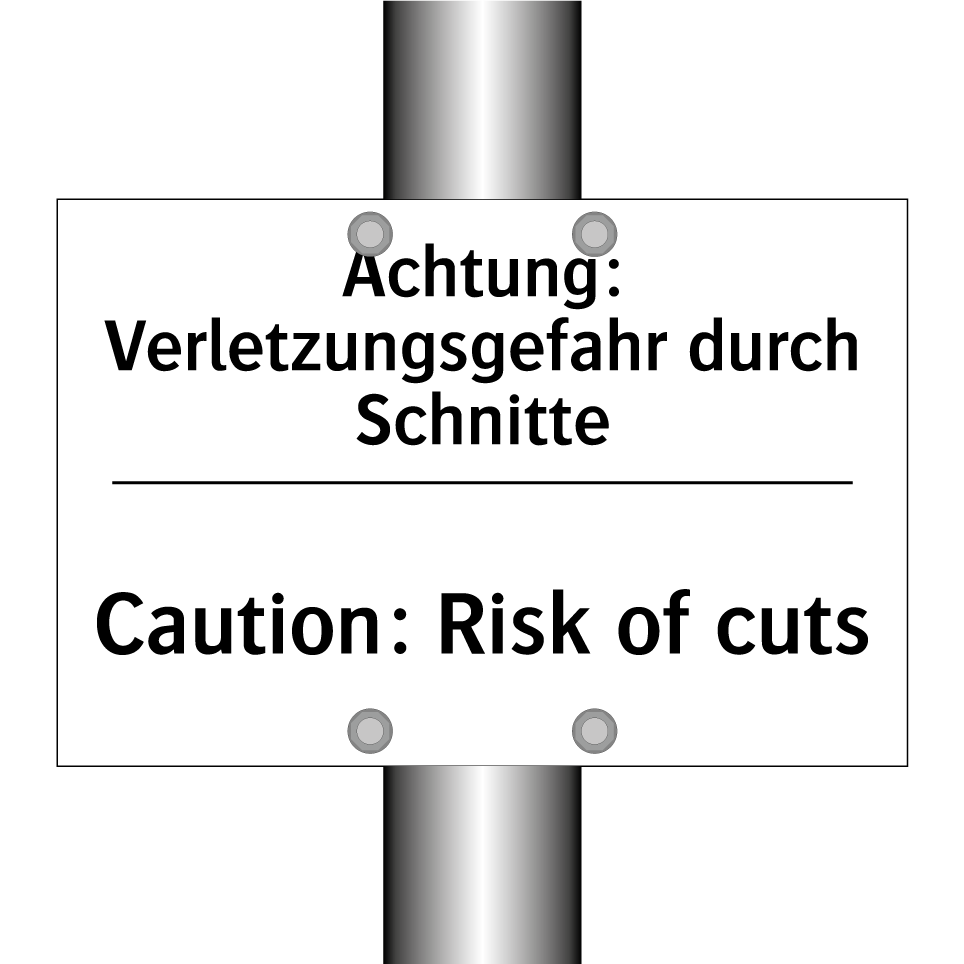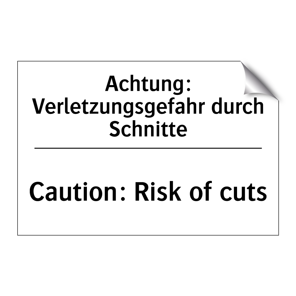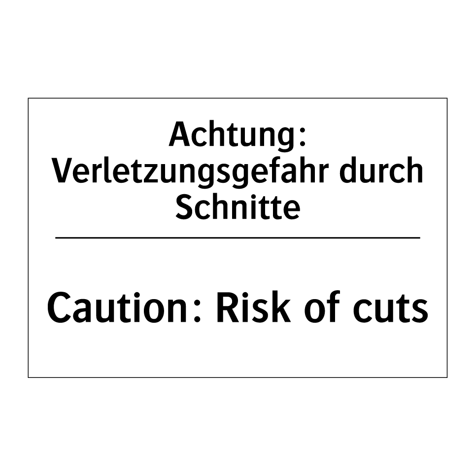 Zweisprachiges Verbotsschild mit deutschem Text Achtung: Verletzungsgefahr durch Schnitte und englischem Text Caution: Risk of cuts