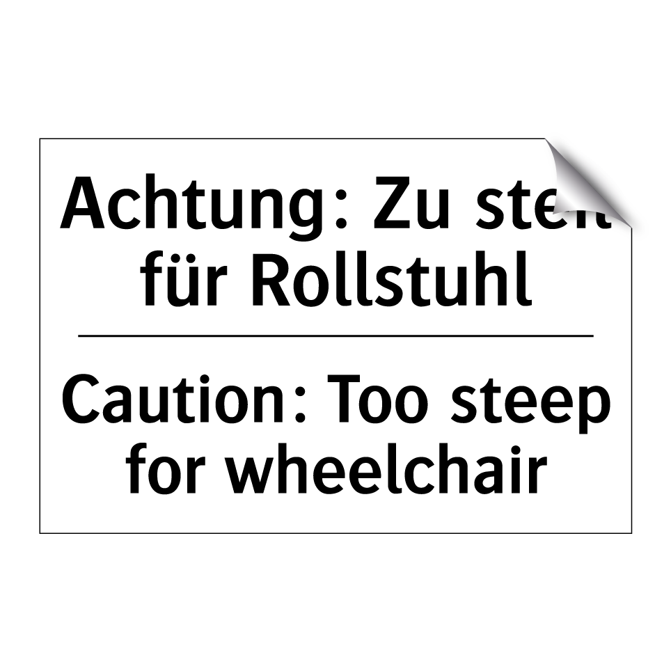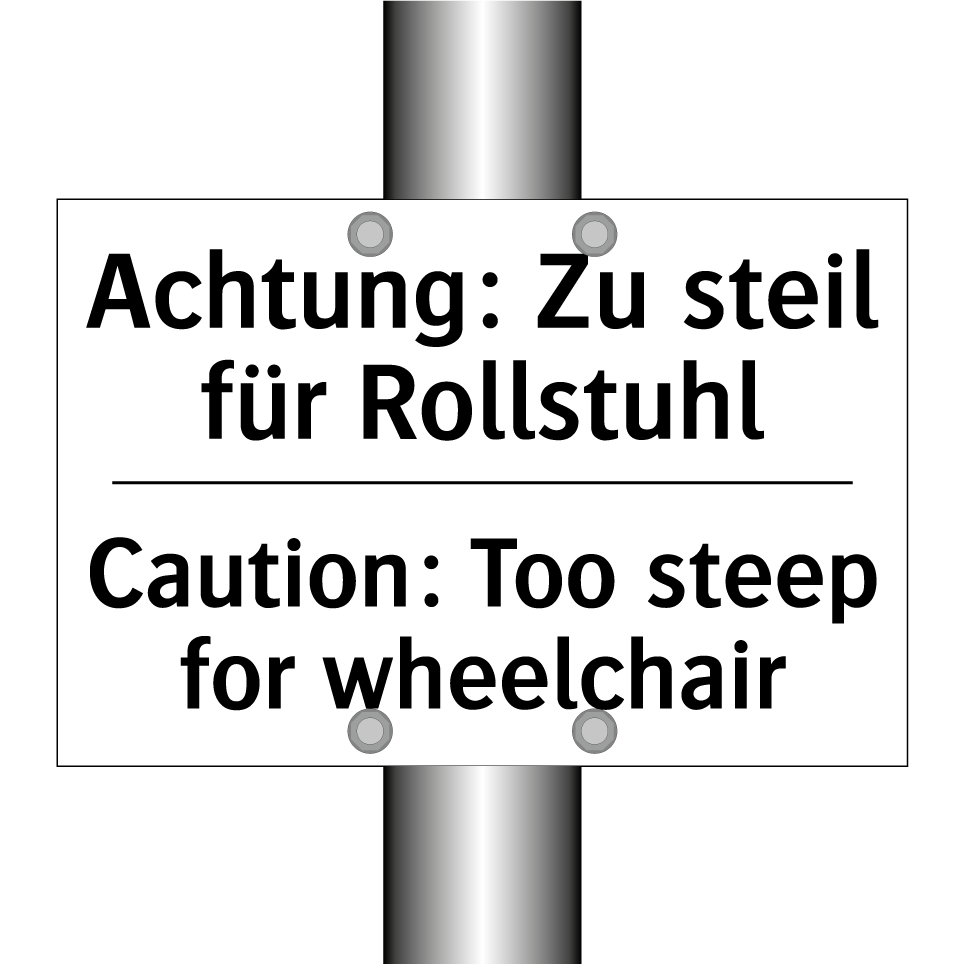 Zweisprachiges Verbotsschild mit deutschem Text Achtung: Zu steil für Rollstuhl und englischem Text Caution: Too steep for wheelchair