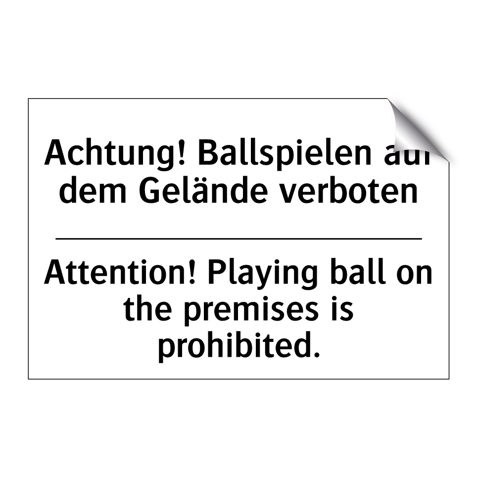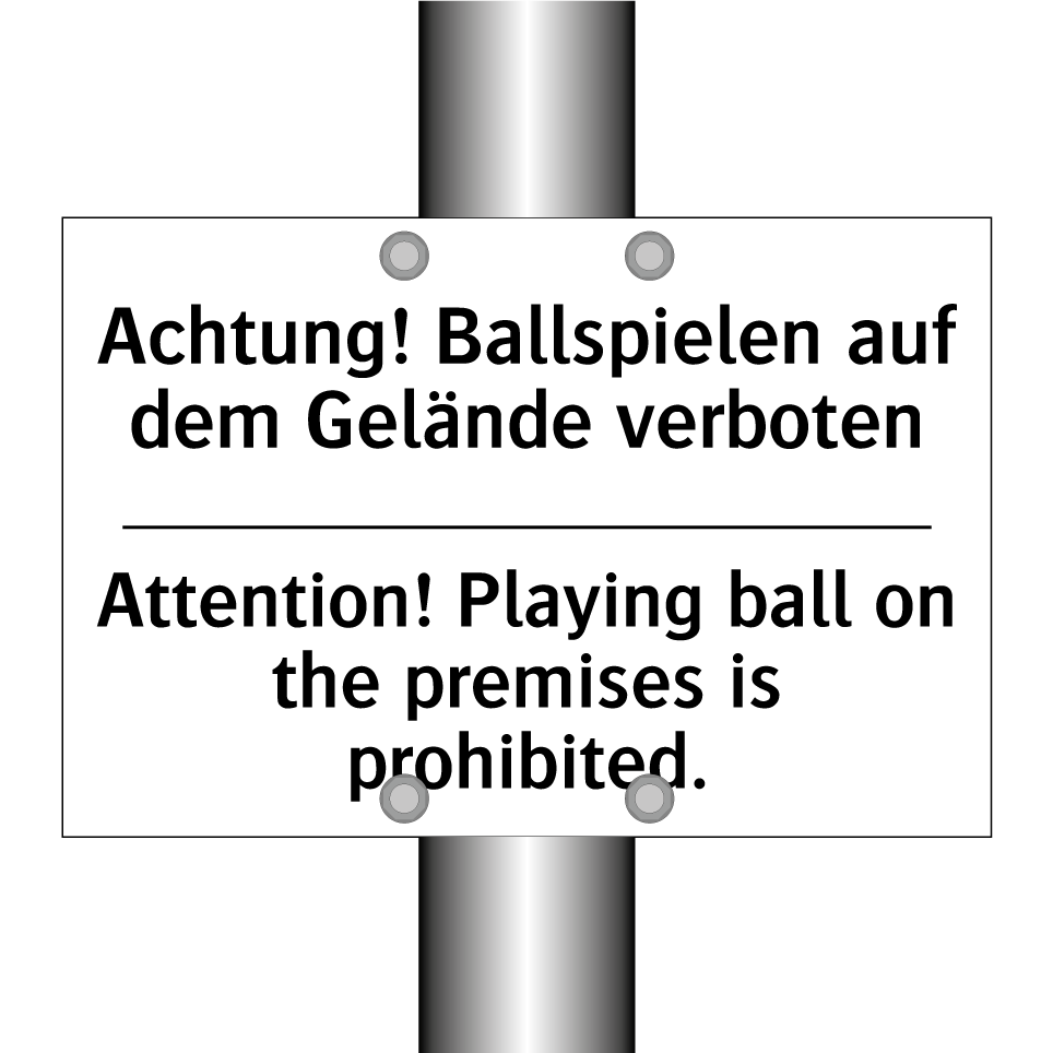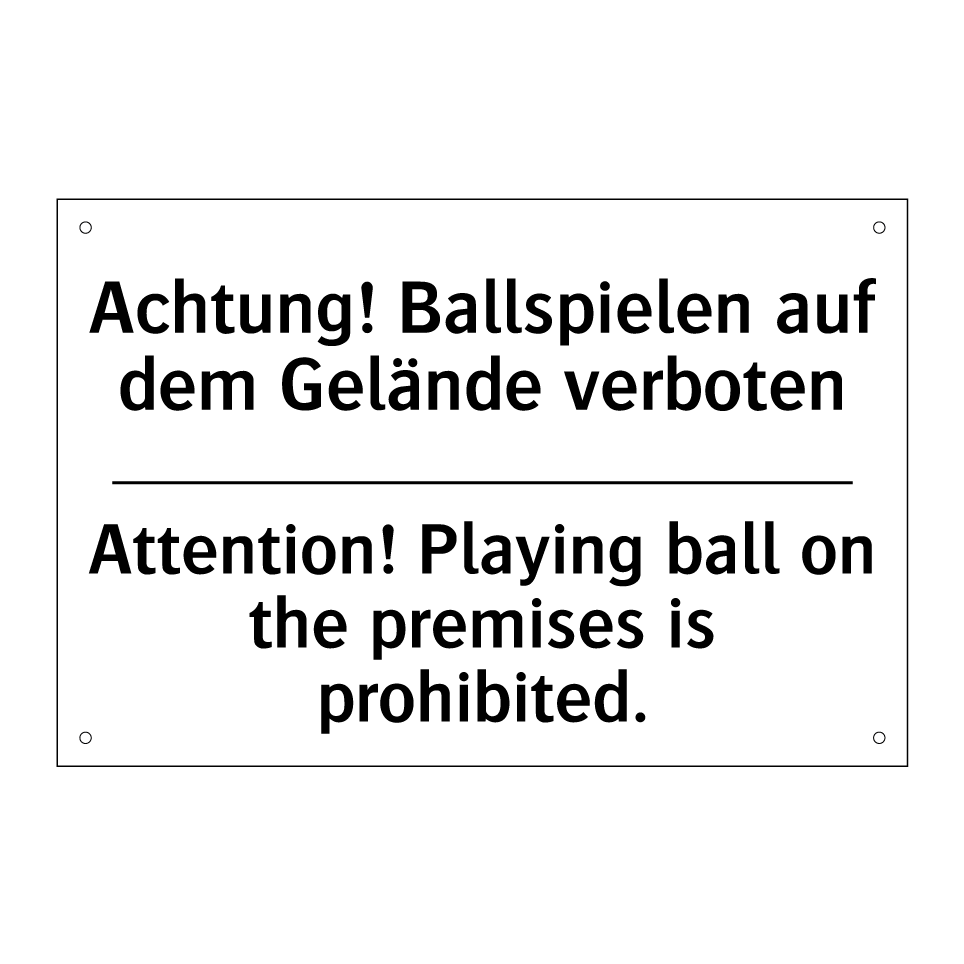 Zweisprachiges Verbotsschild mit deutschem Text Achtung! Ballspielen auf dem Gelände verboten und englischem Text Attention! Playing ball on the premises is prohibited.