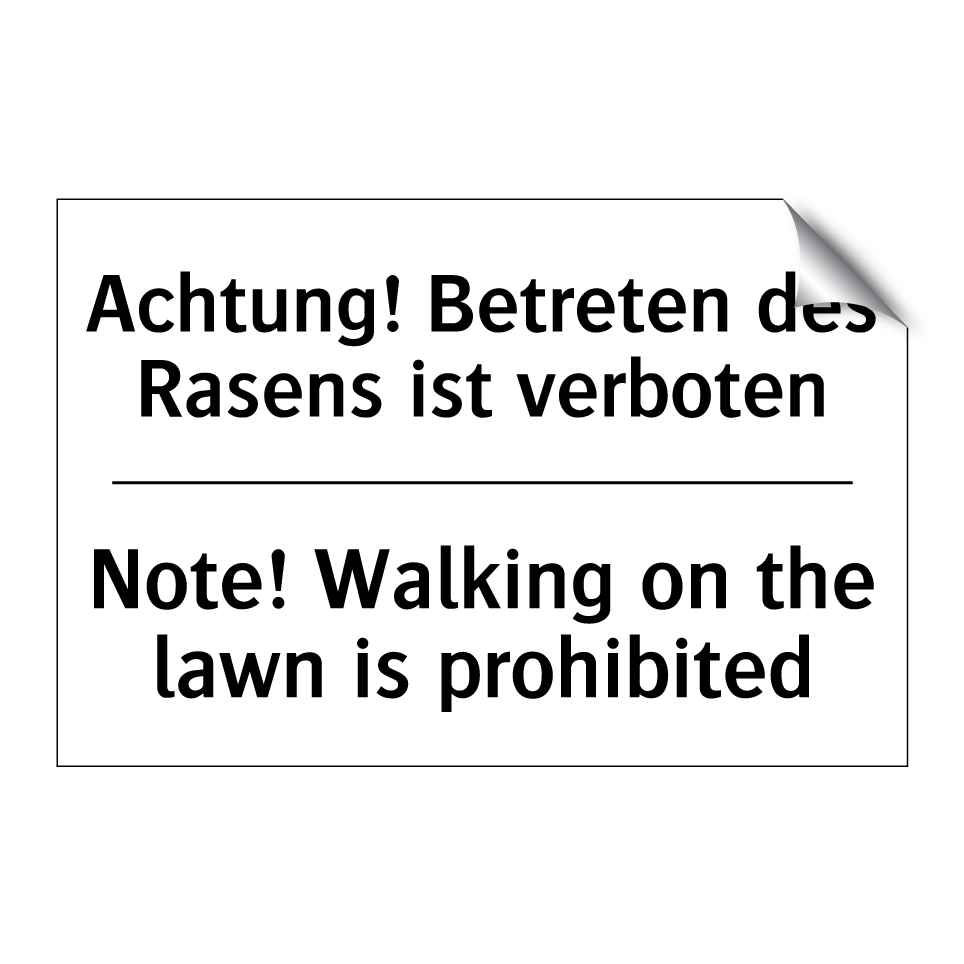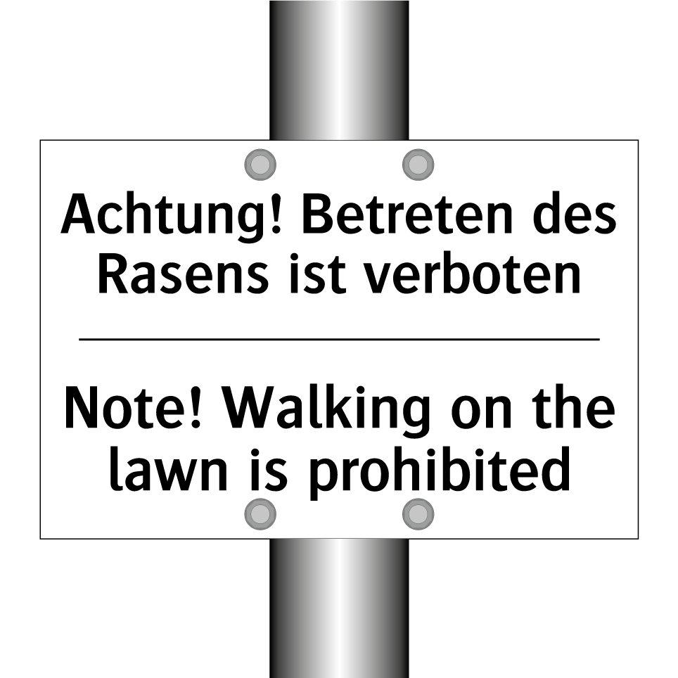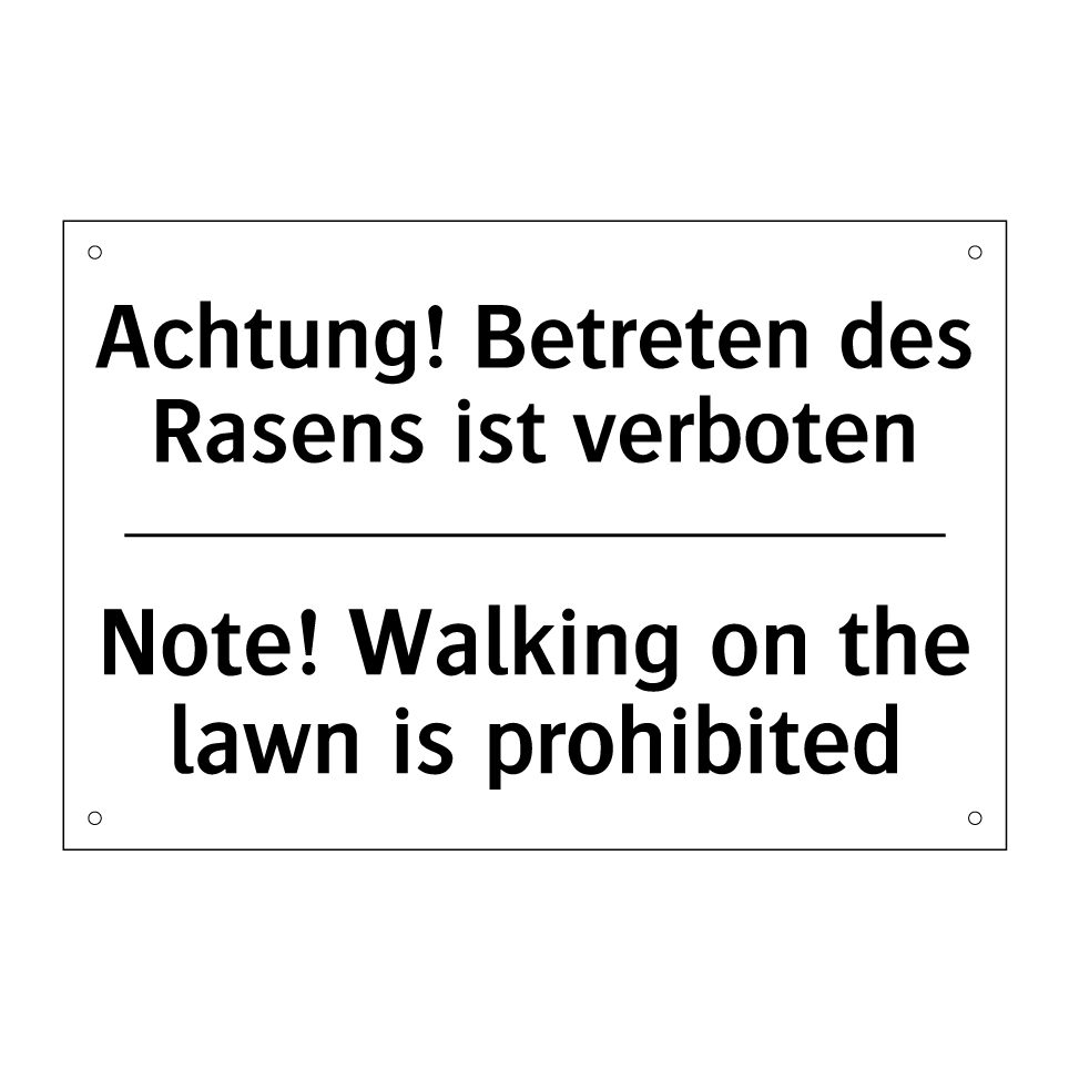 Zweisprachiges Verbotsschild mit deutschem Text Achtung! Betreten des Rasens ist verboten und englischem Text Note! Walking on the lawn is prohibited