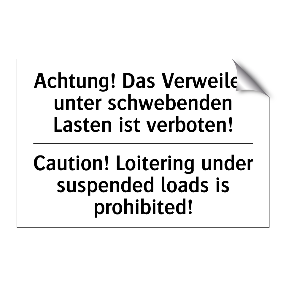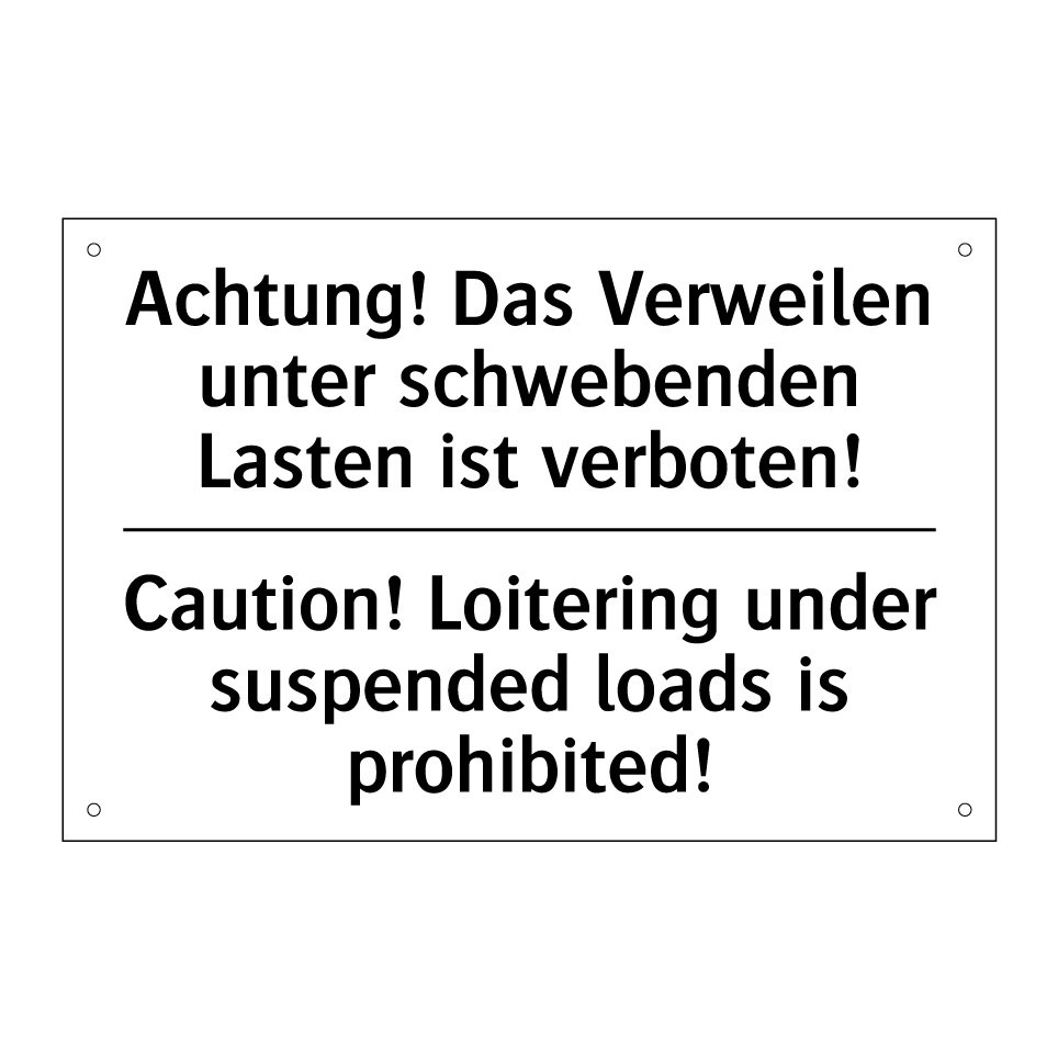 Zweisprachiges Verbotsschild mit deutschem Text Achtung! Das Verweilen unter schwebenden Lasten ist verboten! und englischem Text Caution! Loitering under suspended loads is prohibited!
