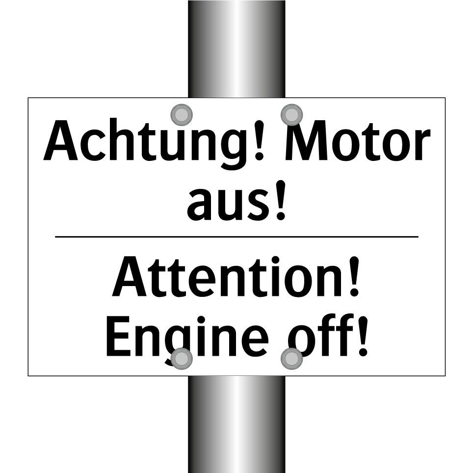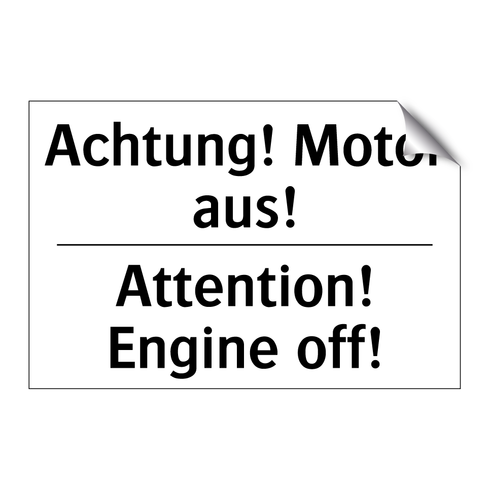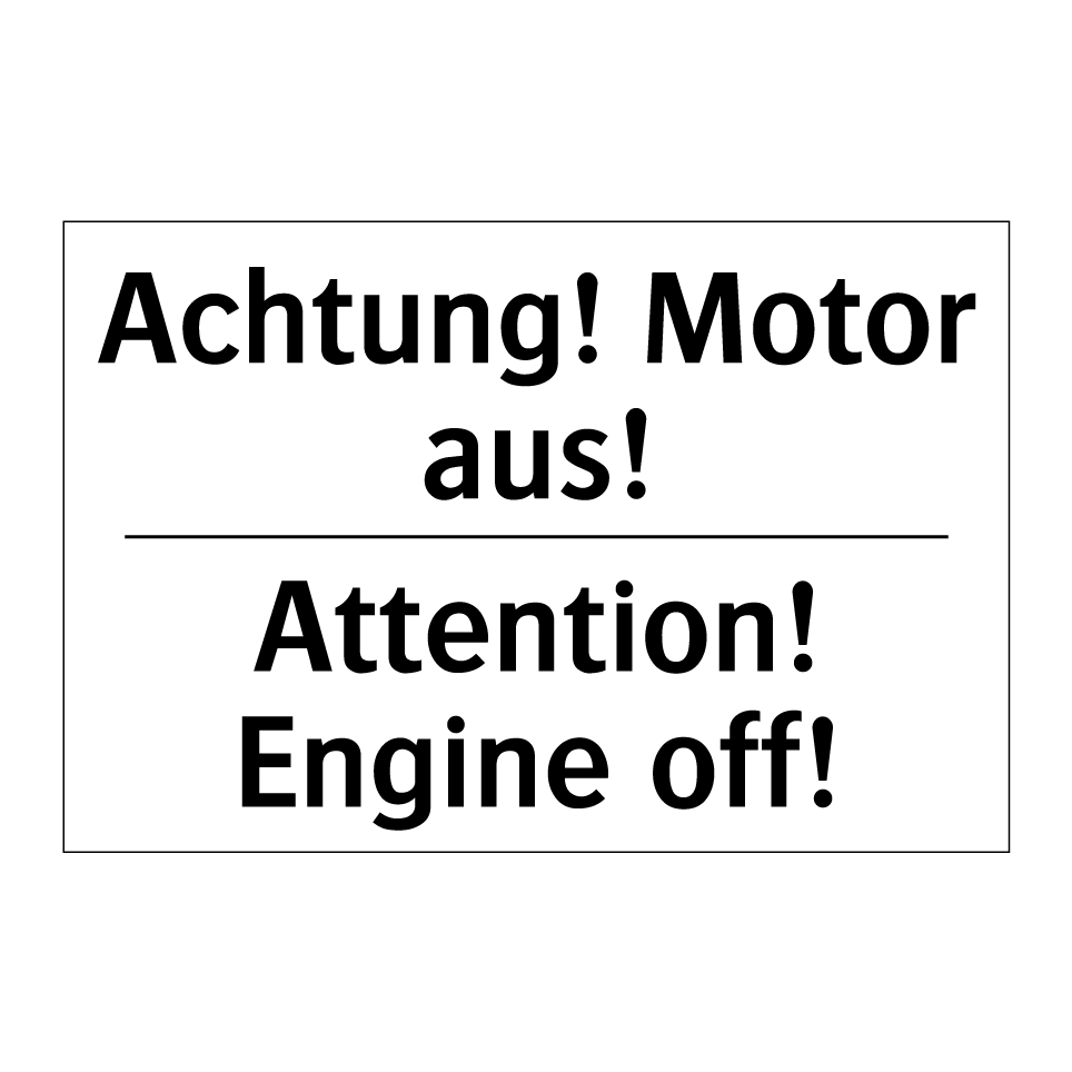 Zweisprachiges Verbotsschild mit deutschem Text Achtung! Motor aus! und englischem Text Attention! Engine off!
