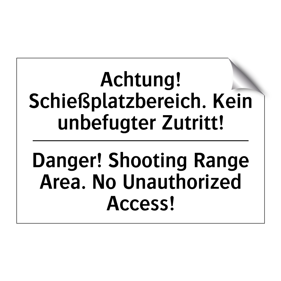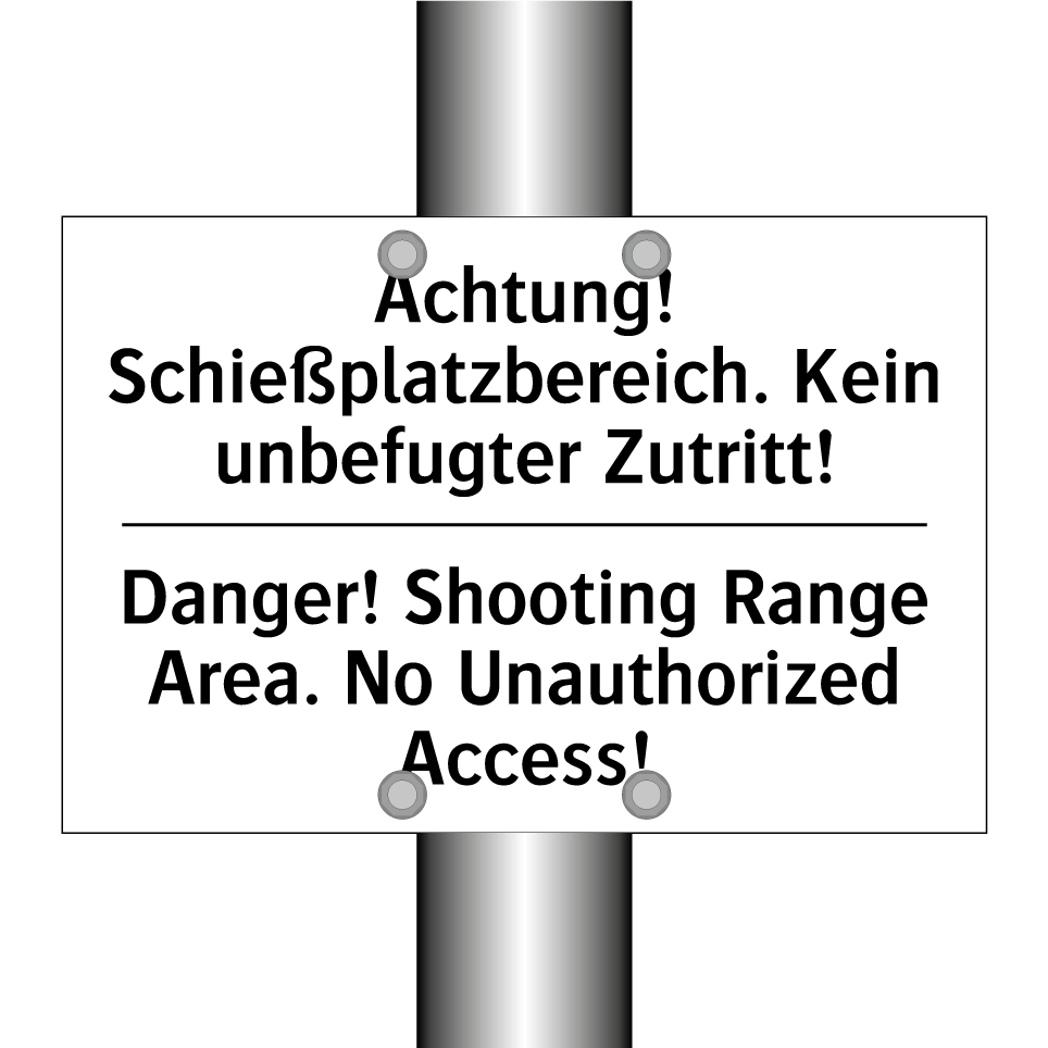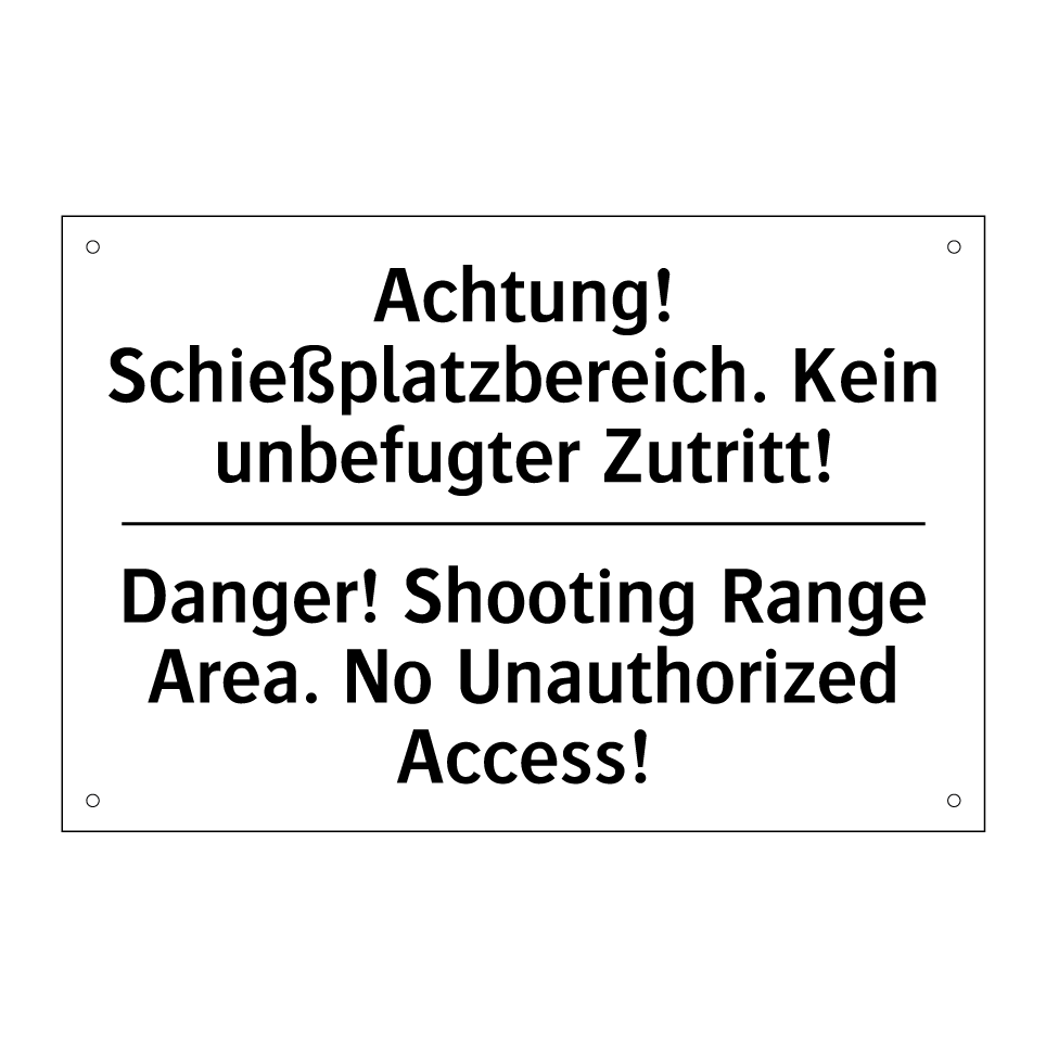 Zweisprachiges Verbotsschild mit deutschem Text Achtung! Schießplatzbereich. Kein unbefugter Zutritt! und englischem Text Danger! Shooting Range Area. No Unauthorized Access!