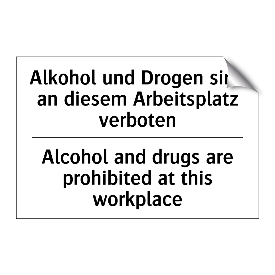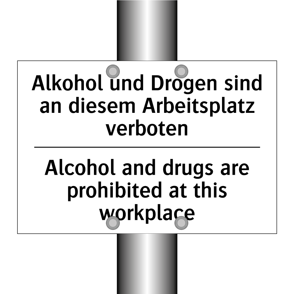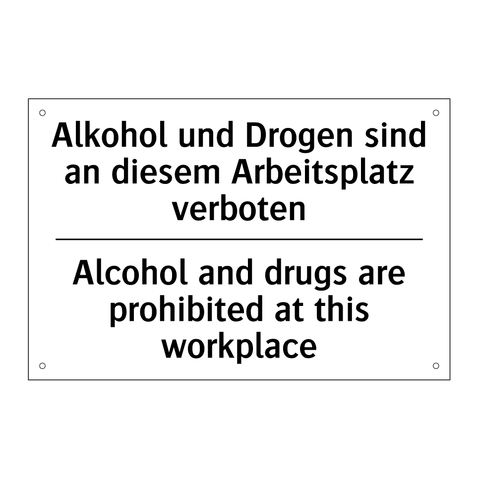 Zweisprachiges Verbotsschild mit deutschem Text Alkohol und Drogen sind an diesem Arbeitsplatz verboten und englischem Text Alcohol and drugs are prohibited at this workplace