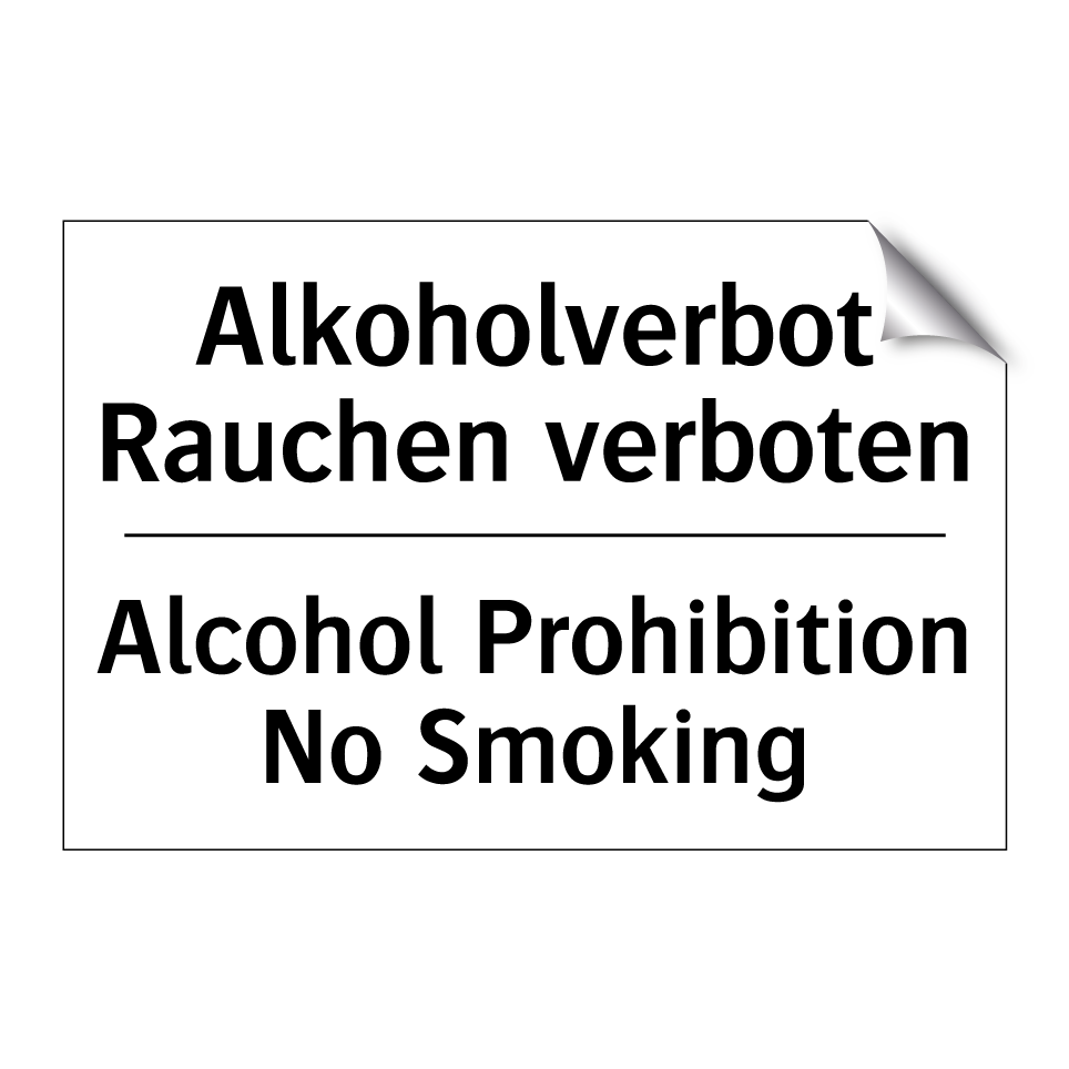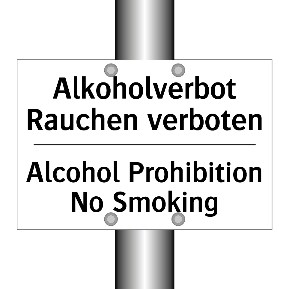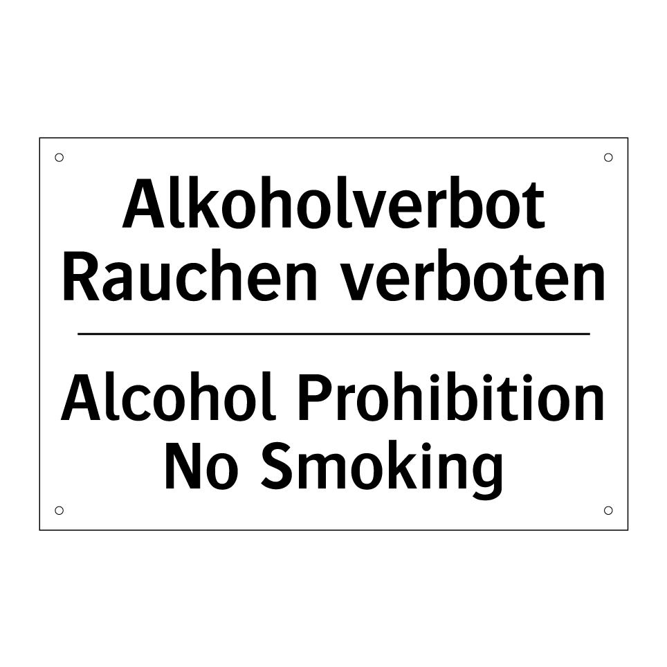 Zweisprachiges Verbotsschild mit deutschem Text Alkoholverbot Rauchen verboten und englischem Text Alcohol Prohibition No Smoking