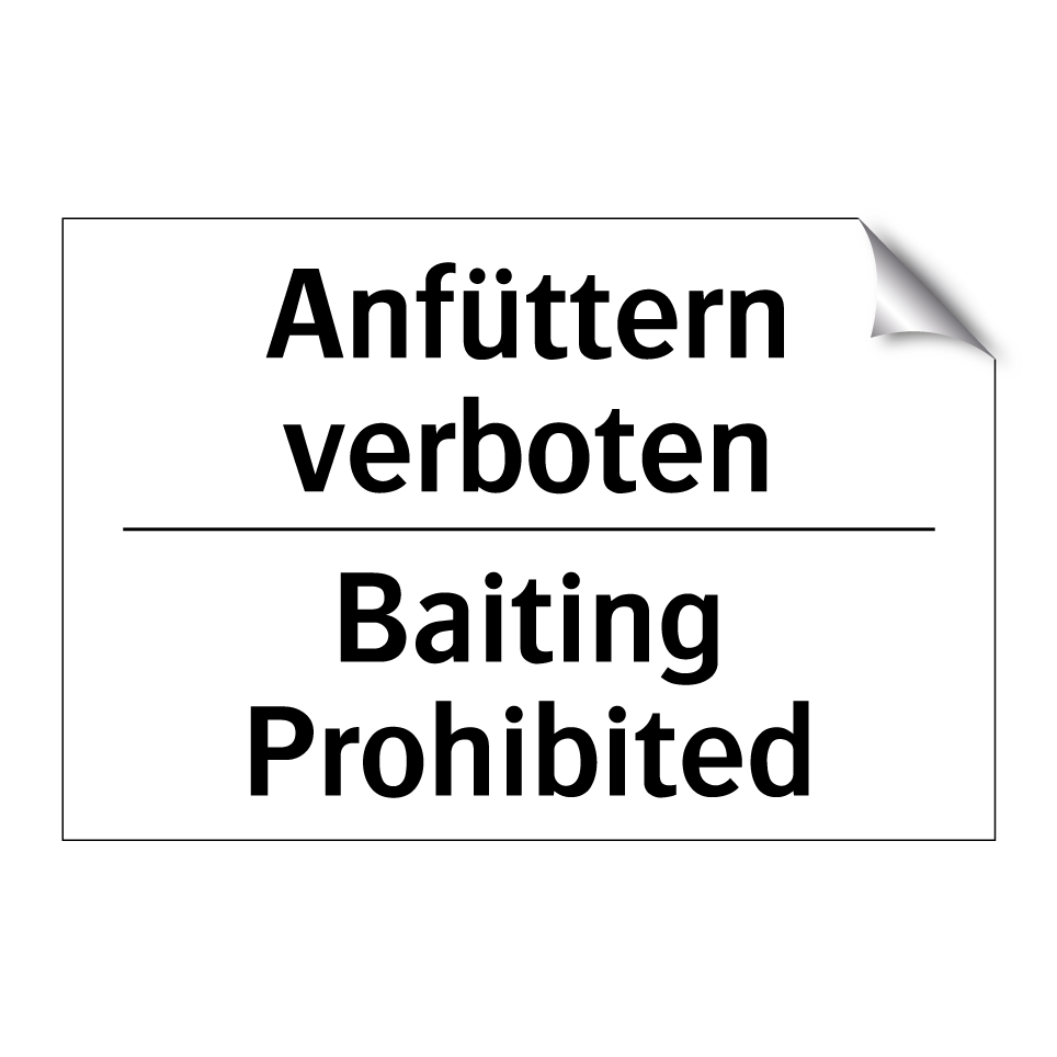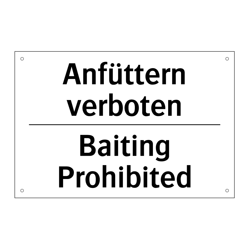 Zweisprachiges Verbotsschild mit deutschem Text Anfüttern verboten und englischem Text Baiting Prohibited