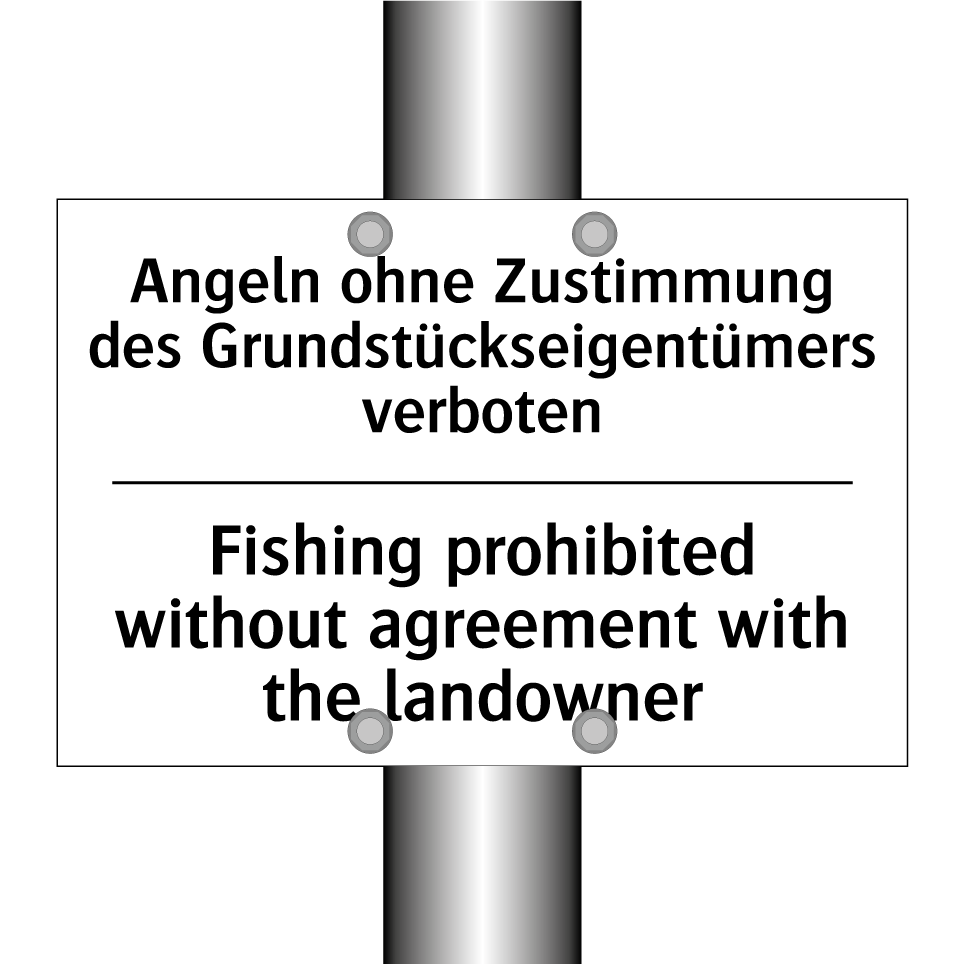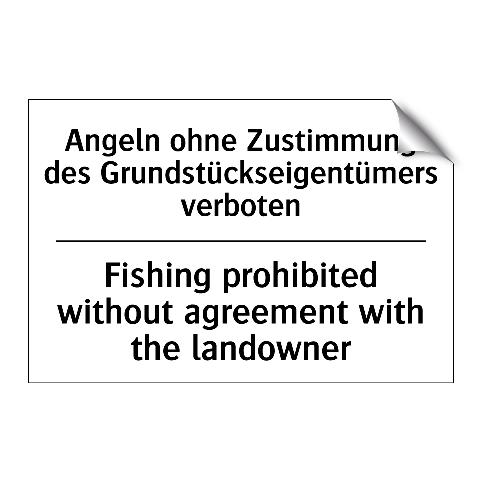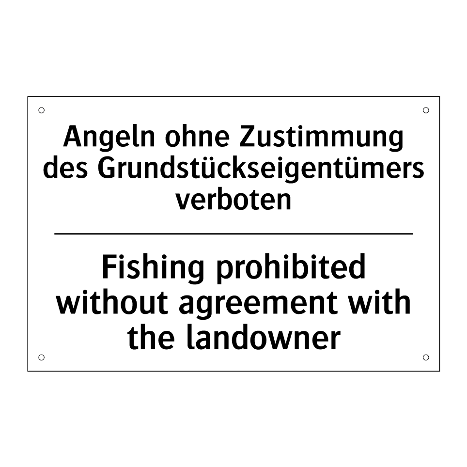 Zweisprachiges Verbotsschild mit deutschem Text Angeln ohne Zustimmung des Grundstückseigentümers verboten und englischem Text Fishing prohibited without agreement with the landowner