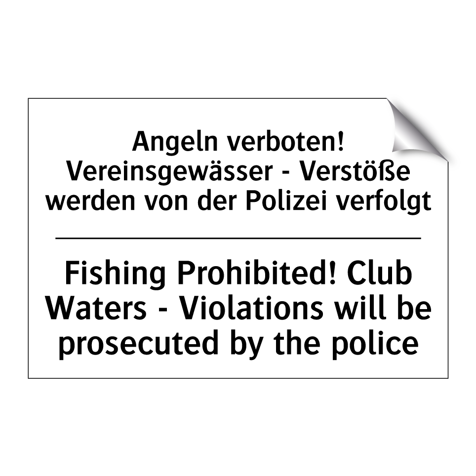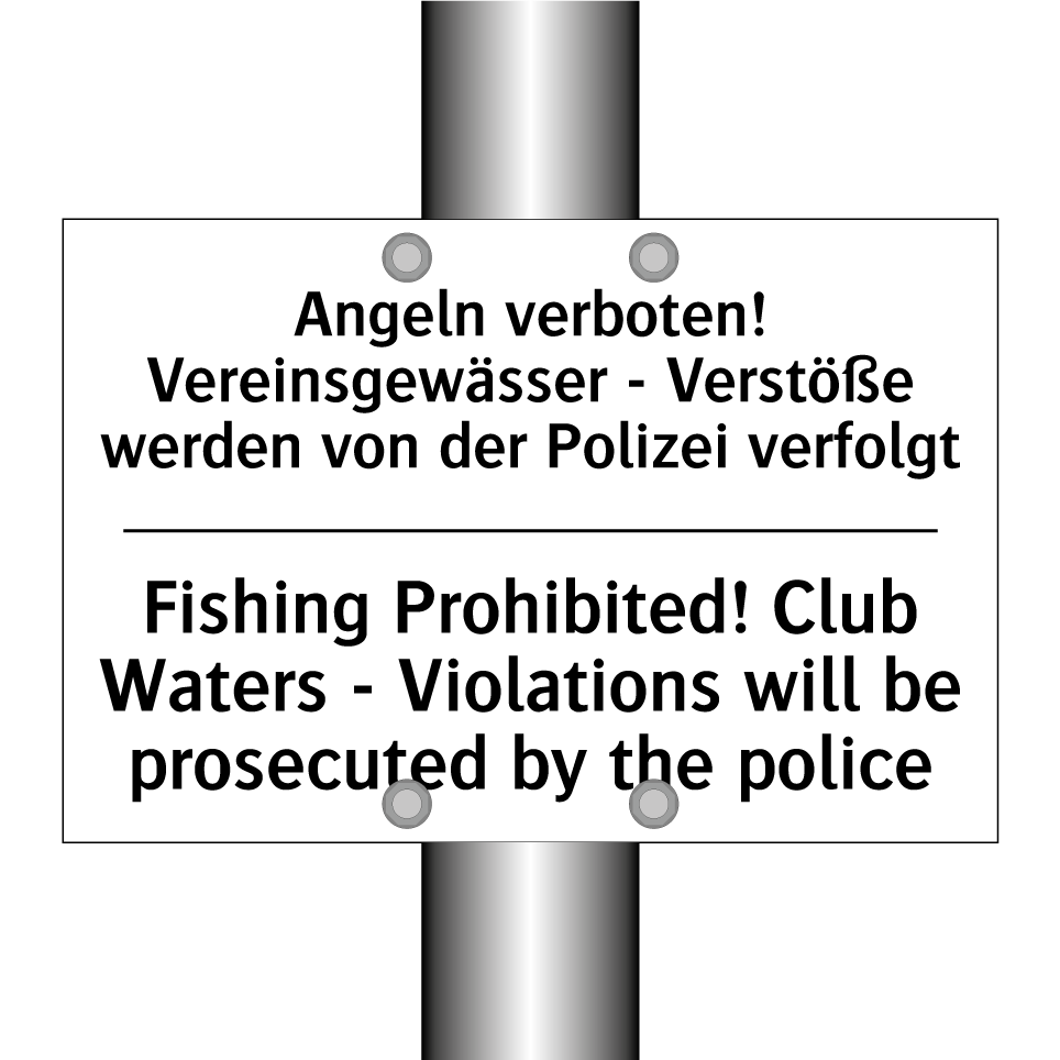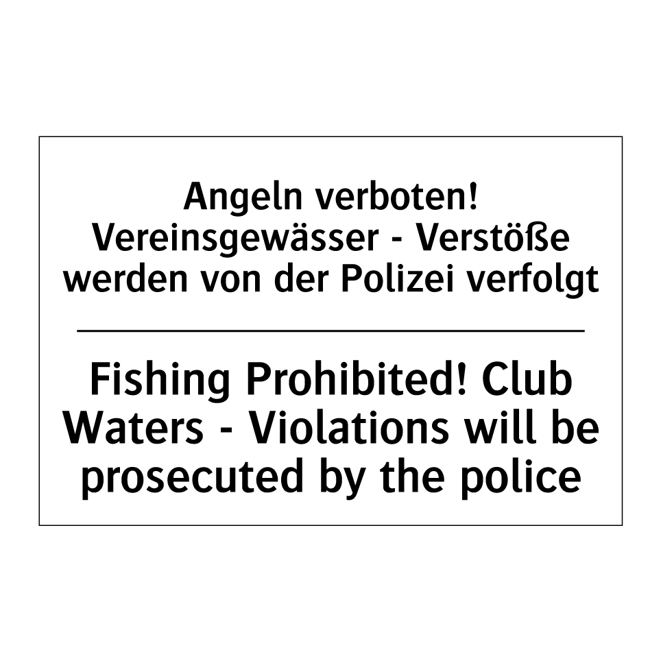 Zweisprachiges Verbotsschild mit deutschem Text Angeln verboten! Vereinsgewässer - Verstöße werden von der Polizei verfolgt und englischem Text Fishing Prohibited! Club Waters - Violations will be prosecuted by the police