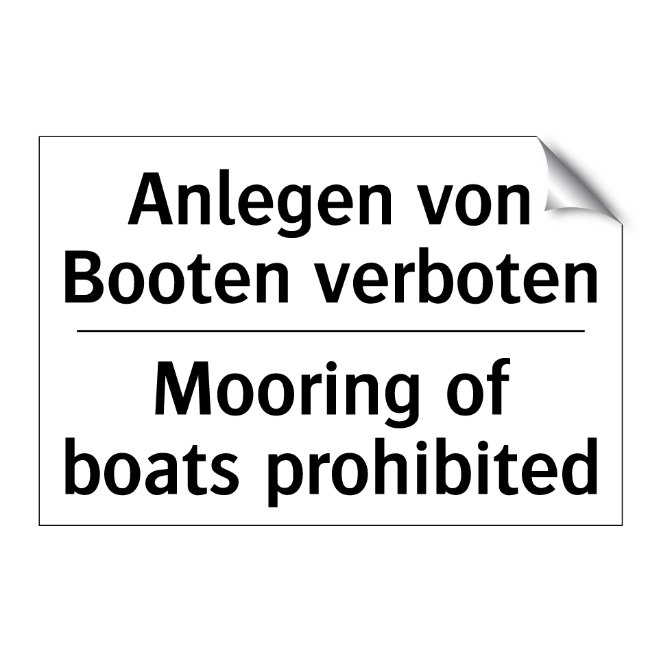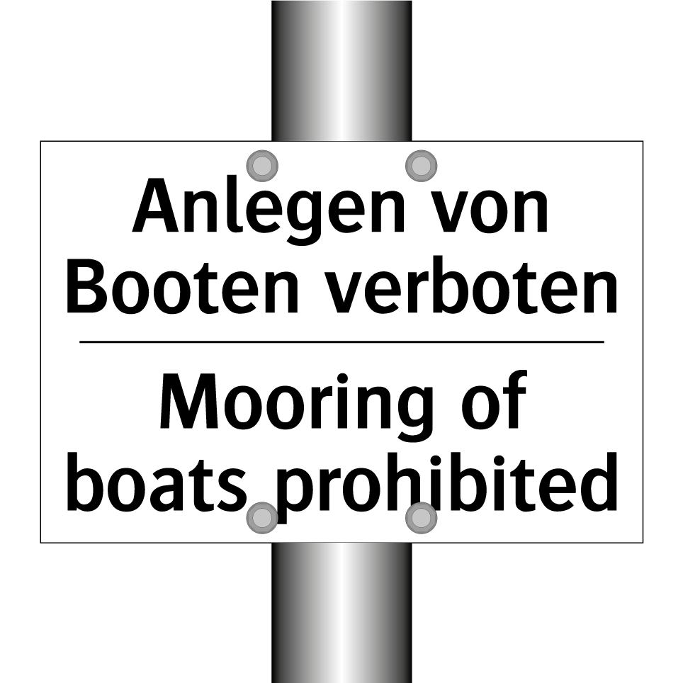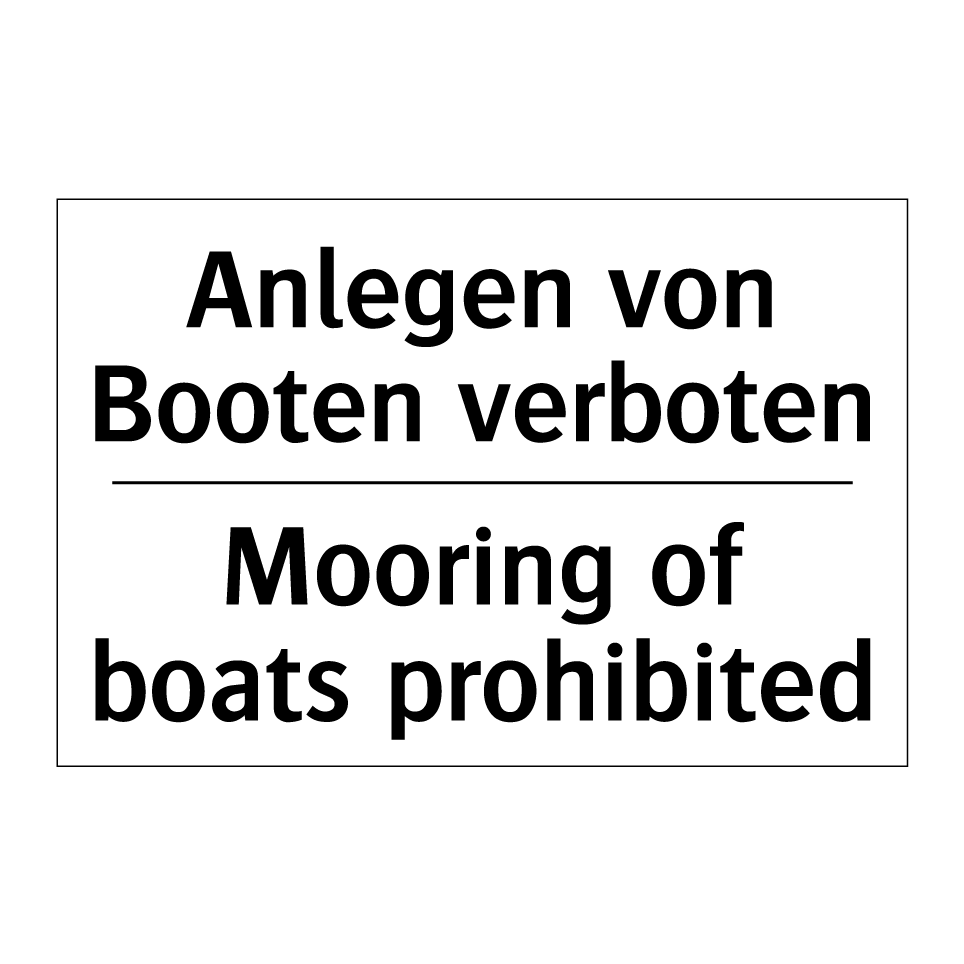 Zweisprachiges Verbotsschild mit deutschem Text Anlegen von Booten verboten und englischem Text Mooring of boats prohibited