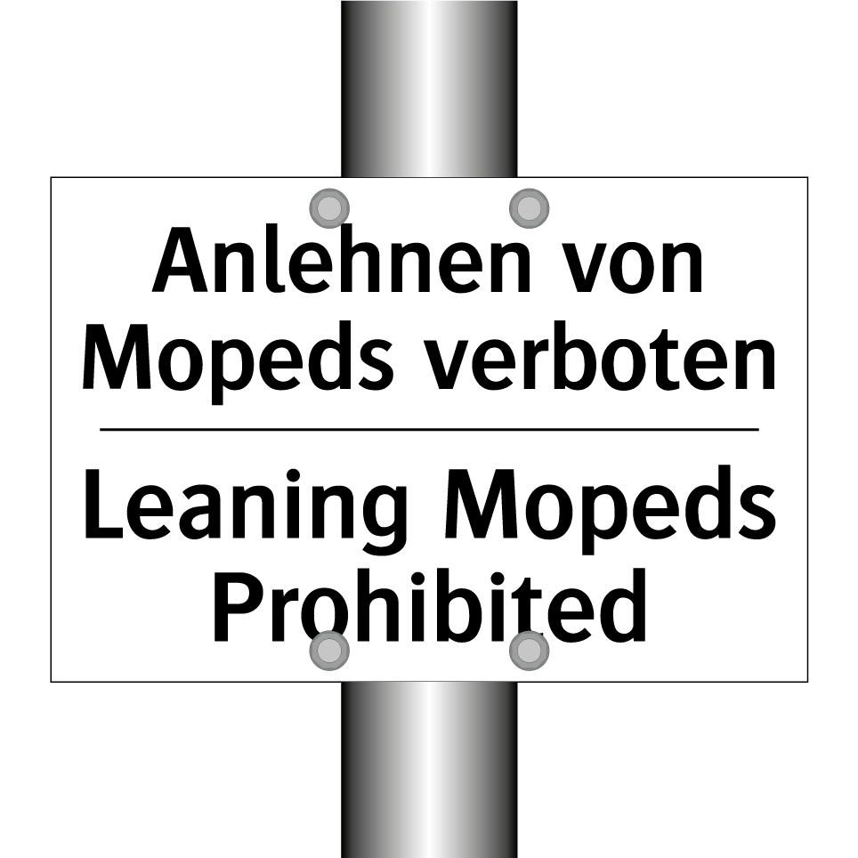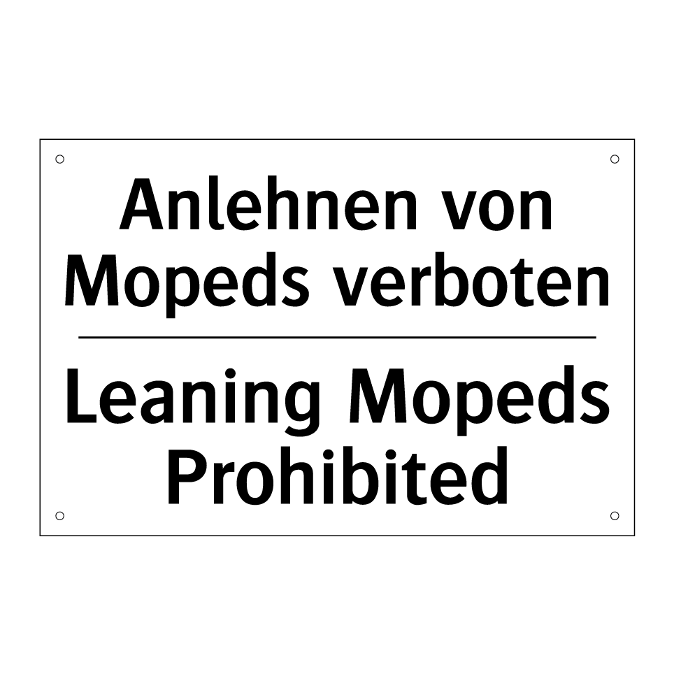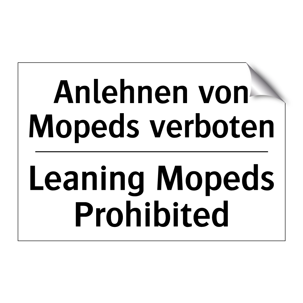 Zweisprachiges Verbotsschild mit deutschem Text Anlehnen von Mopeds verboten und englischem Text Leaning Mopeds Prohibited