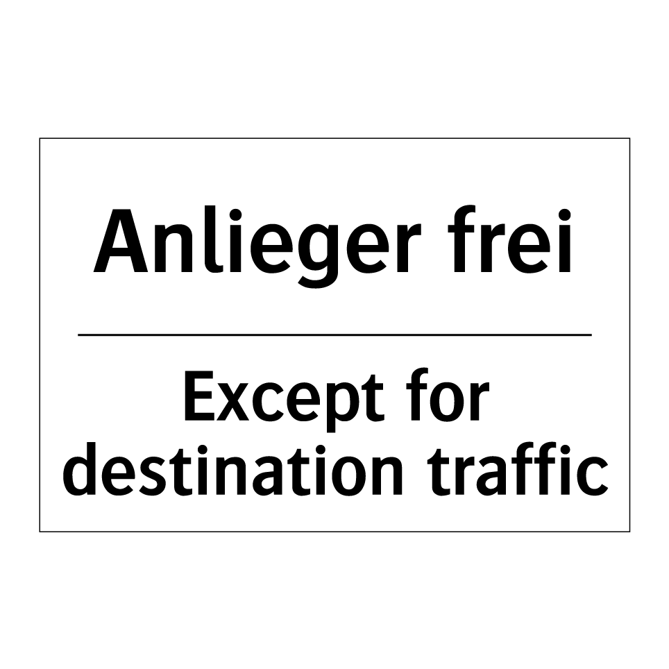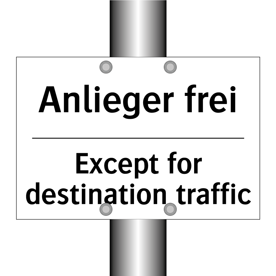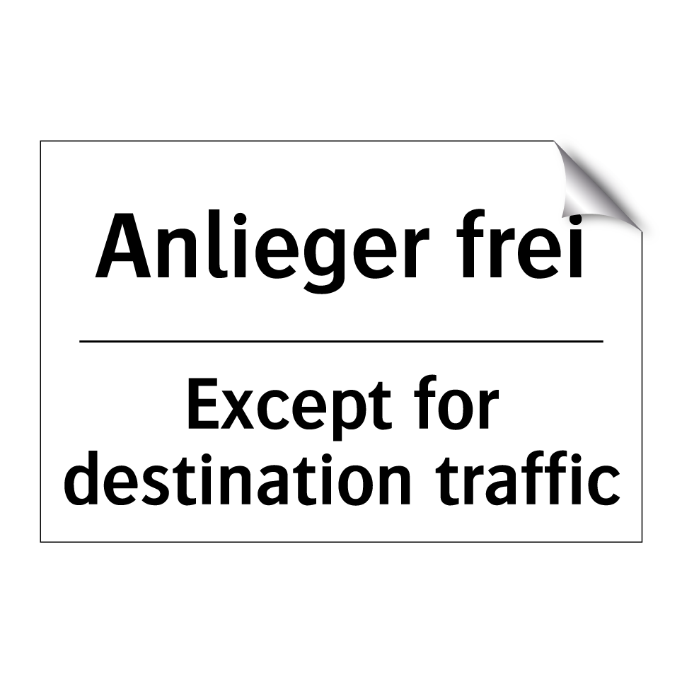 Zweisprachiges Verbotsschild mit deutschem Text Anlieger frei und englischem Text Except for destination traffic