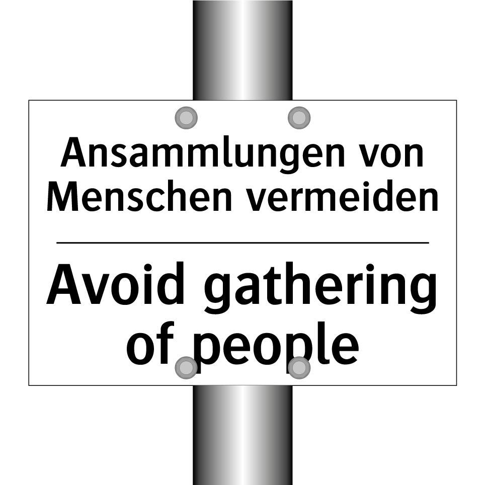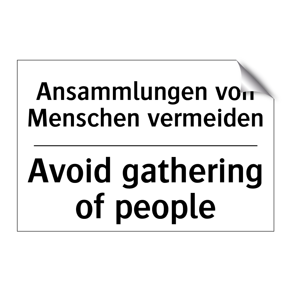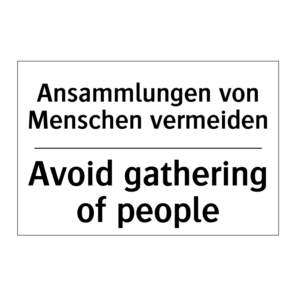 Zweisprachiges Verbotsschild mit deutschem Text Ansammlungen von Menschen vermeiden und englischem Text Avoid gathering of people
