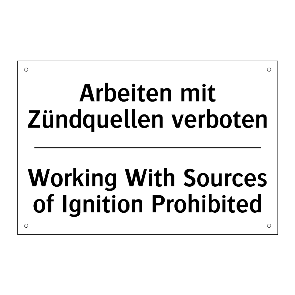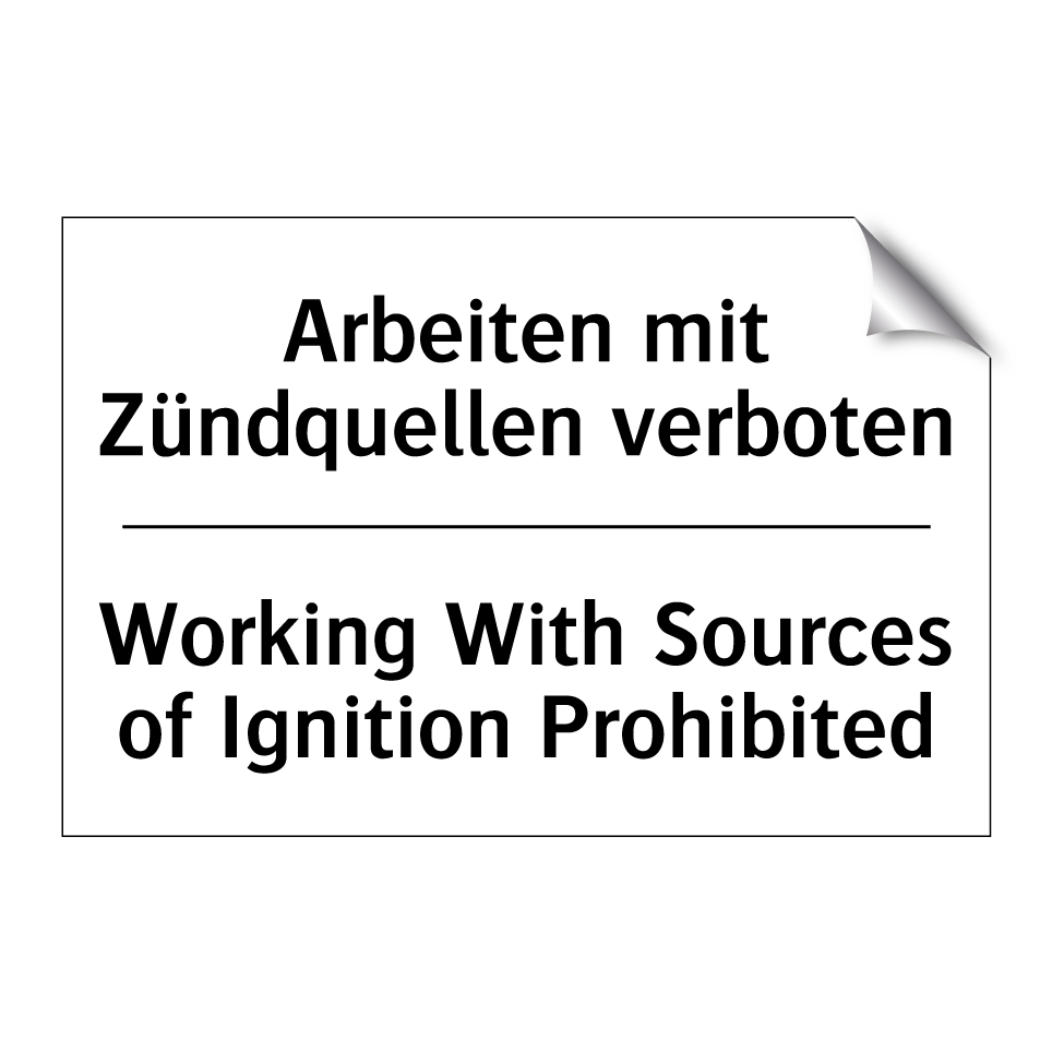 Zweisprachiges Verbotsschild mit deutschem Text Arbeiten mit Zündquellen verboten und englischem Text Working With Sources of Ignition Prohibited