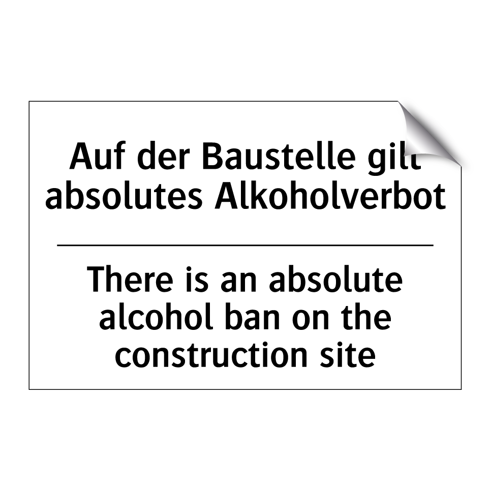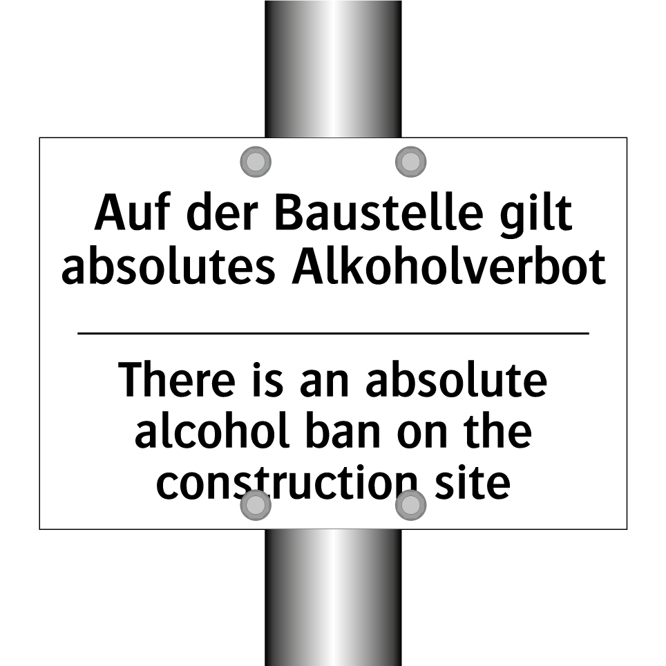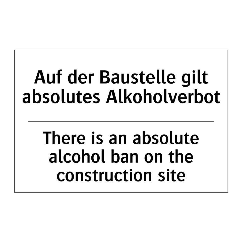 Zweisprachiges Verbotsschild mit deutschem Text Auf der Baustelle gilt absolutes Alkoholverbot und englischem Text There is an absolute alcohol ban on the construction site