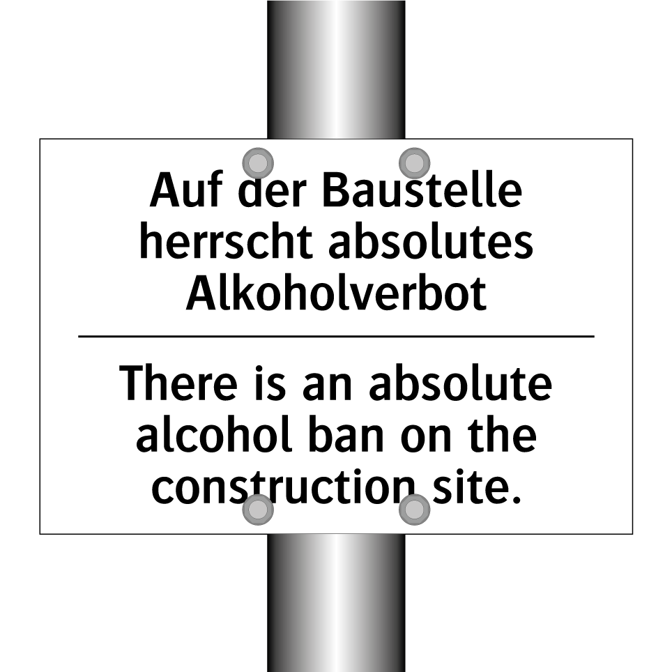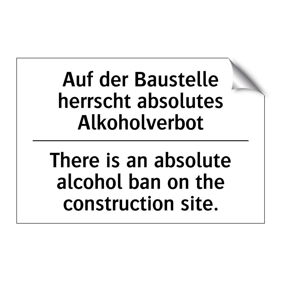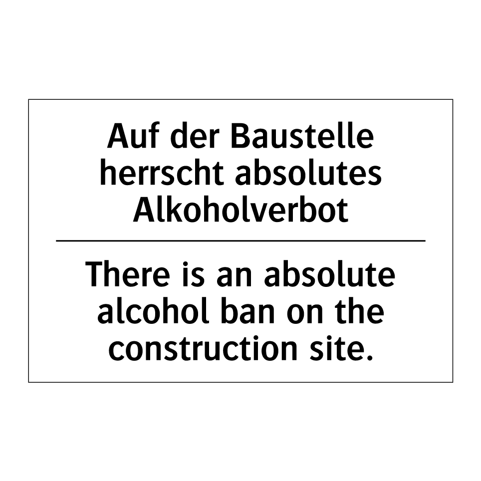 Zweisprachiges Verbotsschild mit deutschem Text Auf der Baustelle herrscht absolutes Alkoholverbot und englischem Text There is an absolute alcohol ban on the construction site.