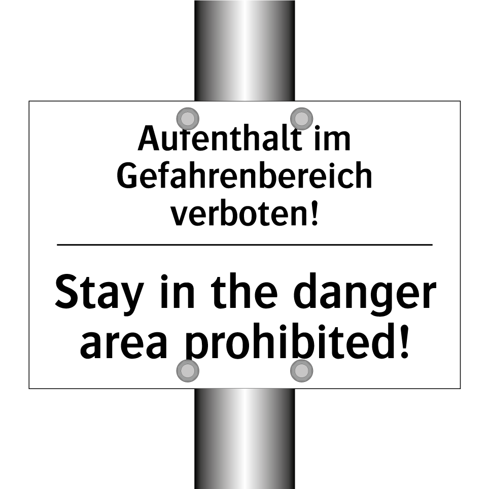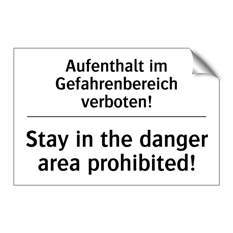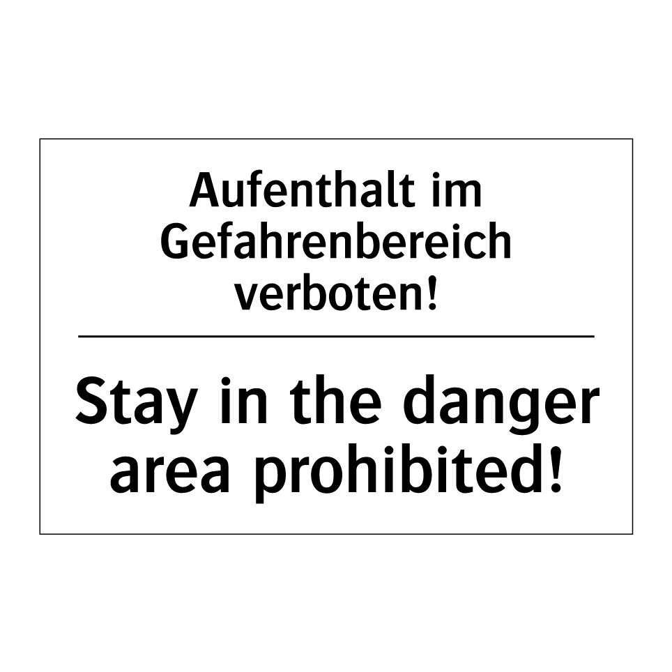 Zweisprachiges Verbotsschild mit deutschem Text Aufenthalt im Gefahrenbereich verboten! und englischem Text Stay in the danger area prohibited!