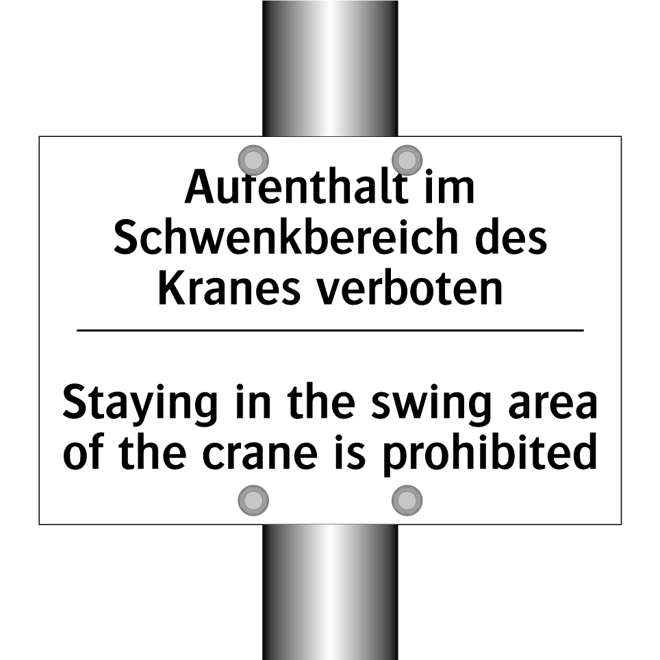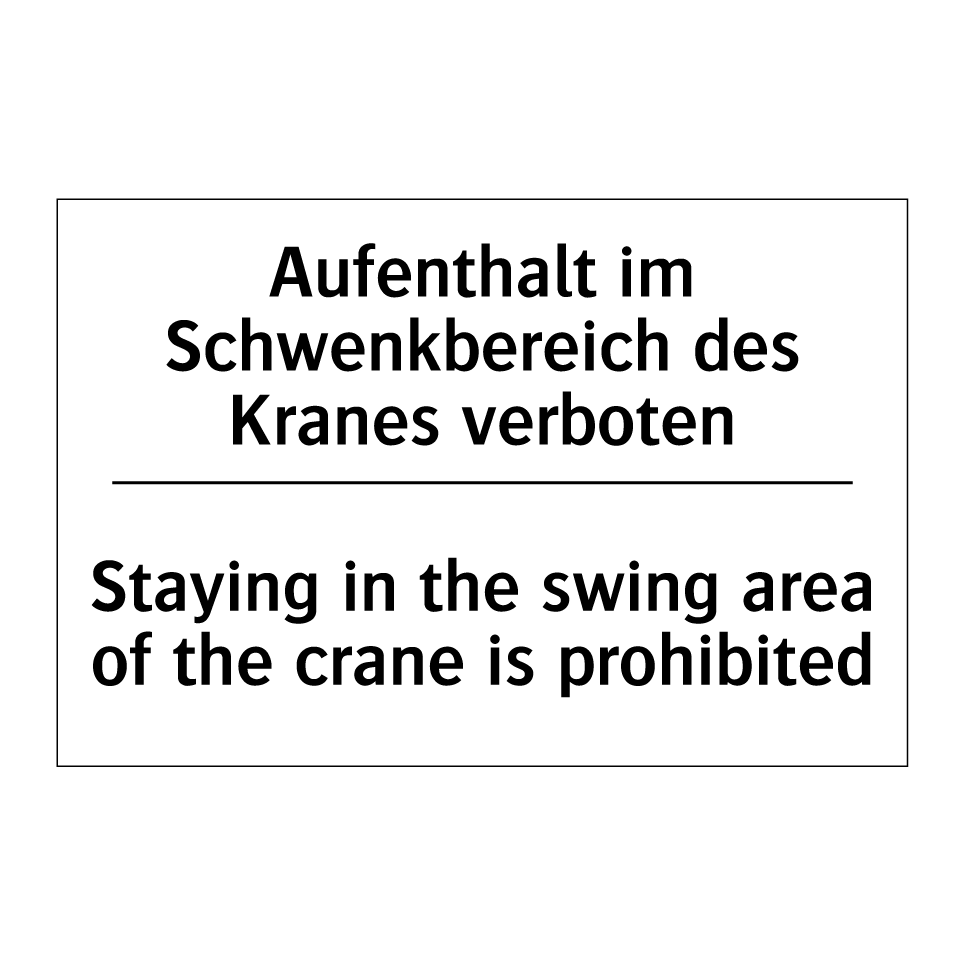 Zweisprachiges Verbotsschild mit deutschem Text Aufenthalt im Schwenkbereich des Kranes verboten und englischem Text Staying in the swing area of the crane is prohibited