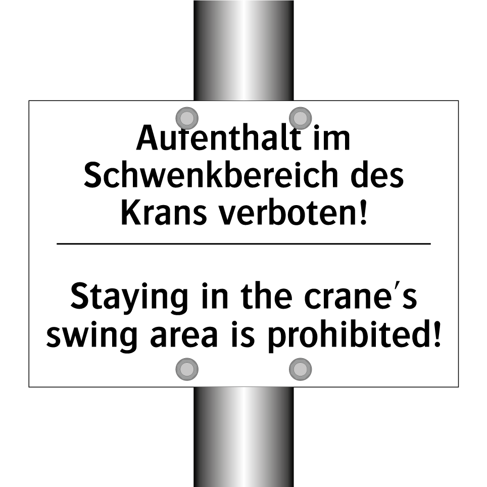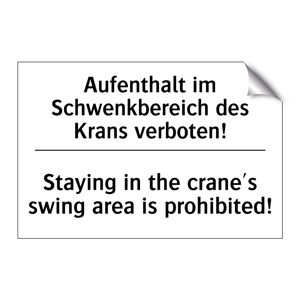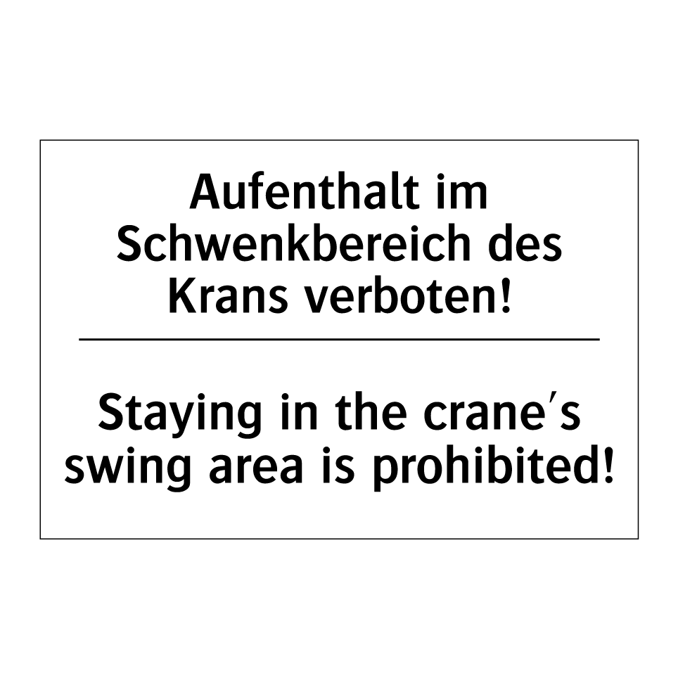 Zweisprachiges Verbotsschild mit deutschem Text Aufenthalt im Schwenkbereich des Krans verboten! und englischem Text Staying in the crane's swing area is prohibited!