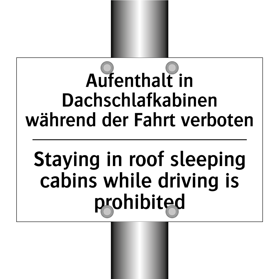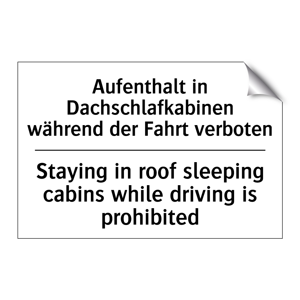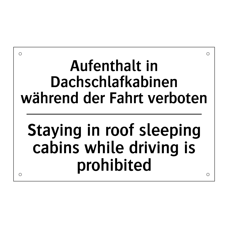 Zweisprachiges Verbotsschild mit deutschem Text Aufenthalt in Dachschlafkabinen während der Fahrt verboten und englischem Text Staying in roof sleeping cabins while driving is prohibited
