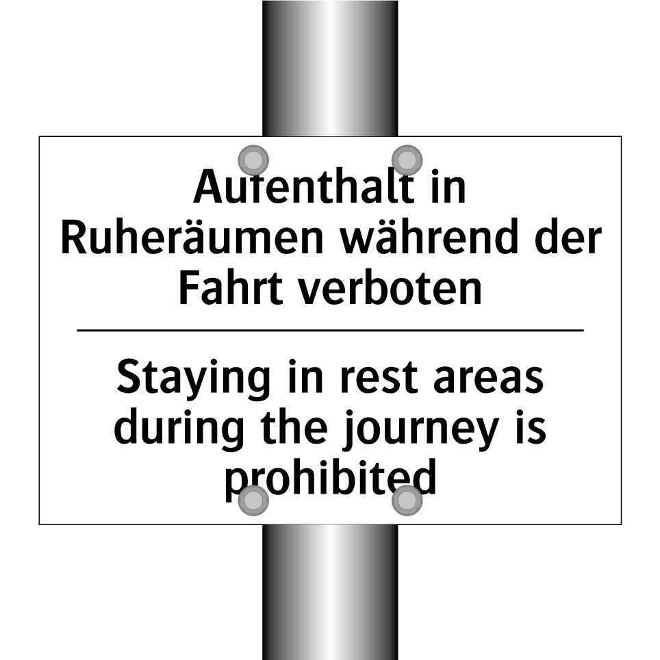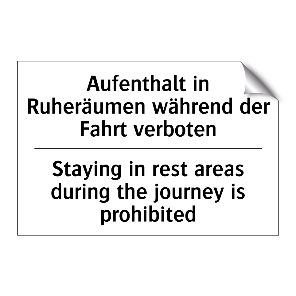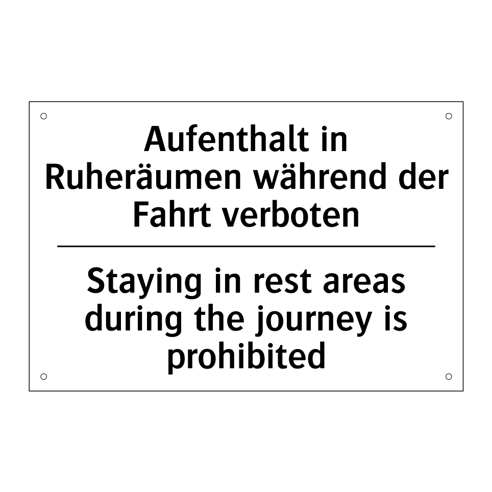 Zweisprachiges Verbotsschild mit deutschem Text Aufenthalt in Ruheräumen während der Fahrt verboten und englischem Text Staying in rest areas during the journey is prohibited