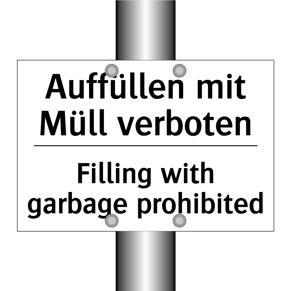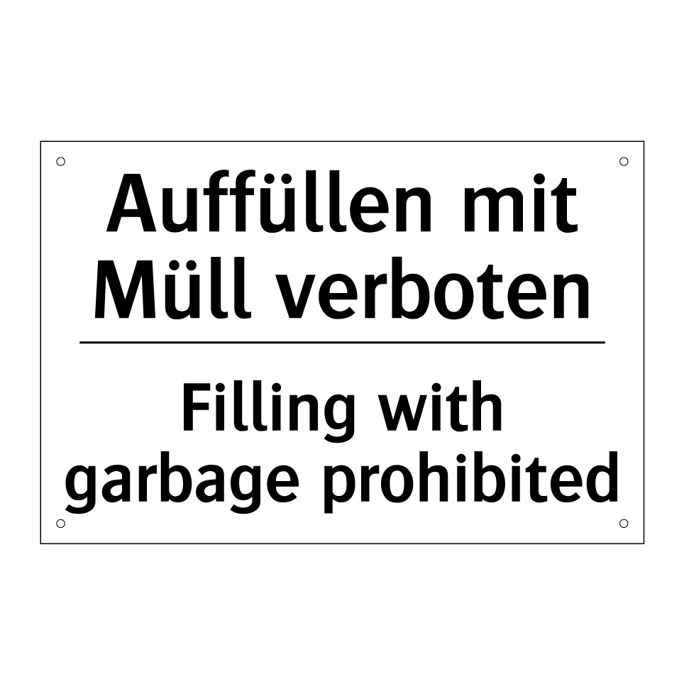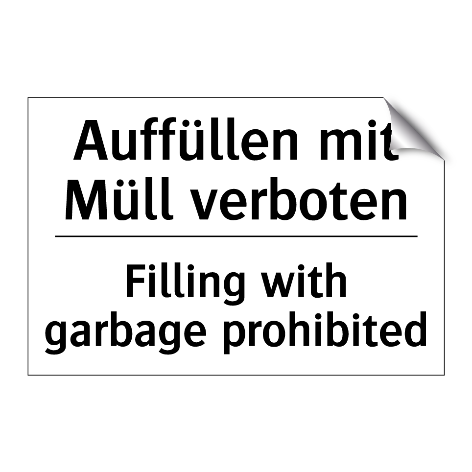 Zweisprachiges Verbotsschild mit deutschem Text Auffüllen mit Müll verboten und englischem Text Filling with garbage prohibited
