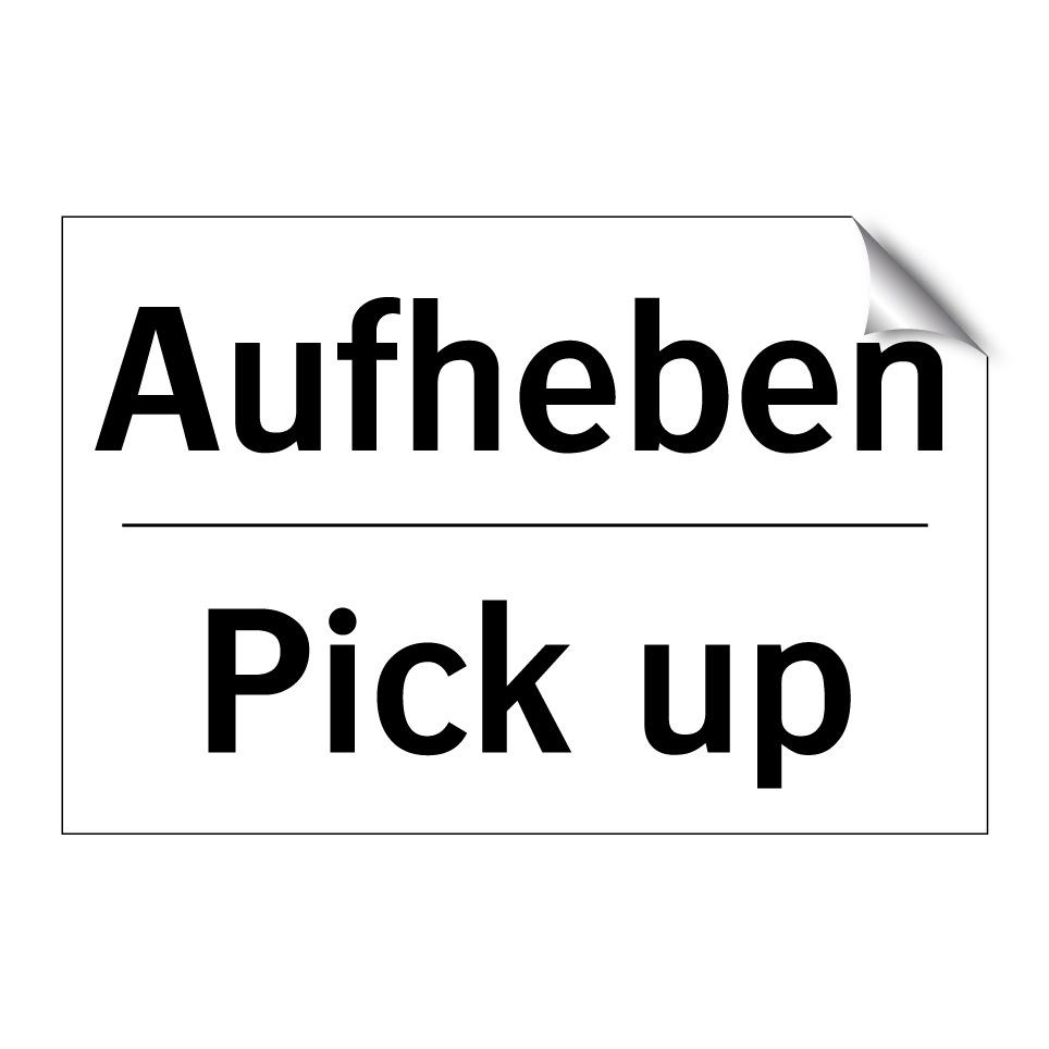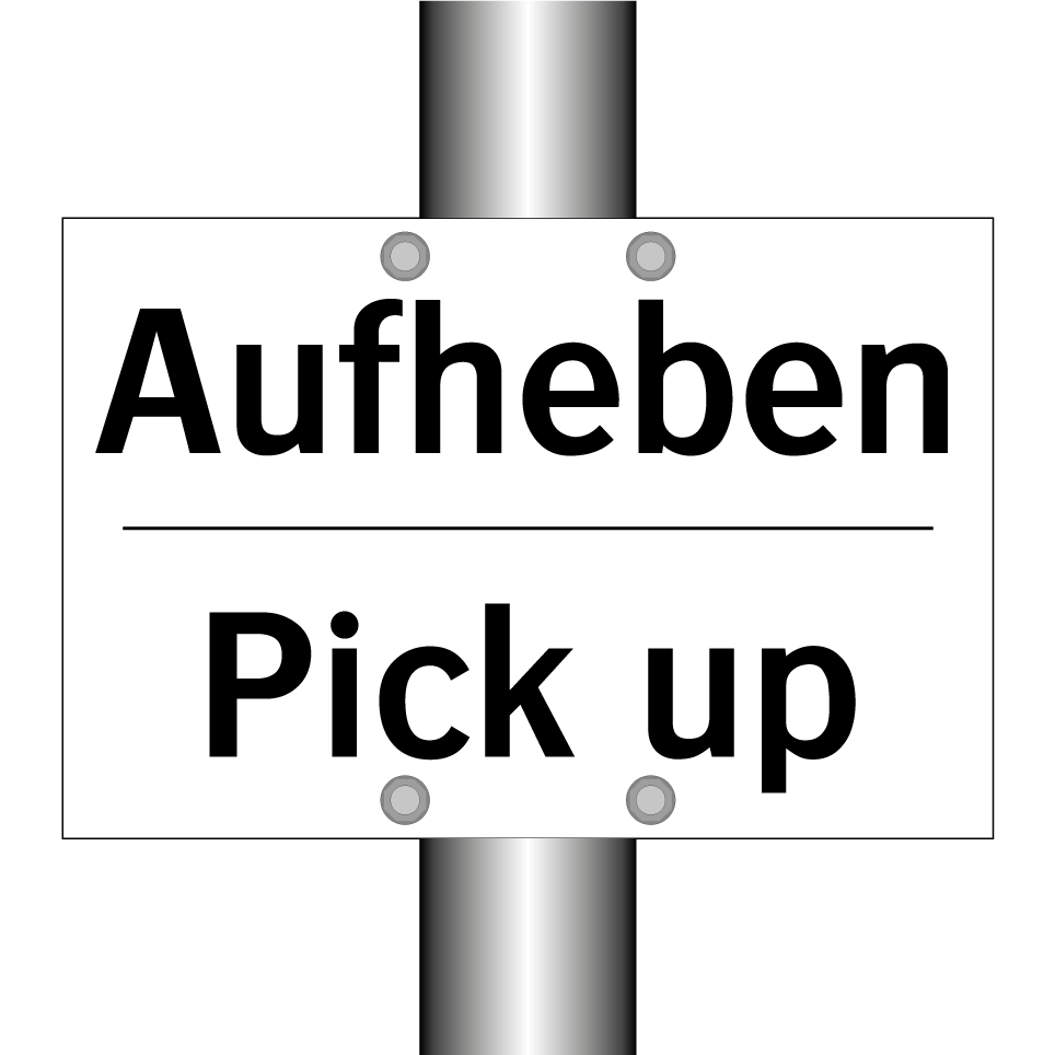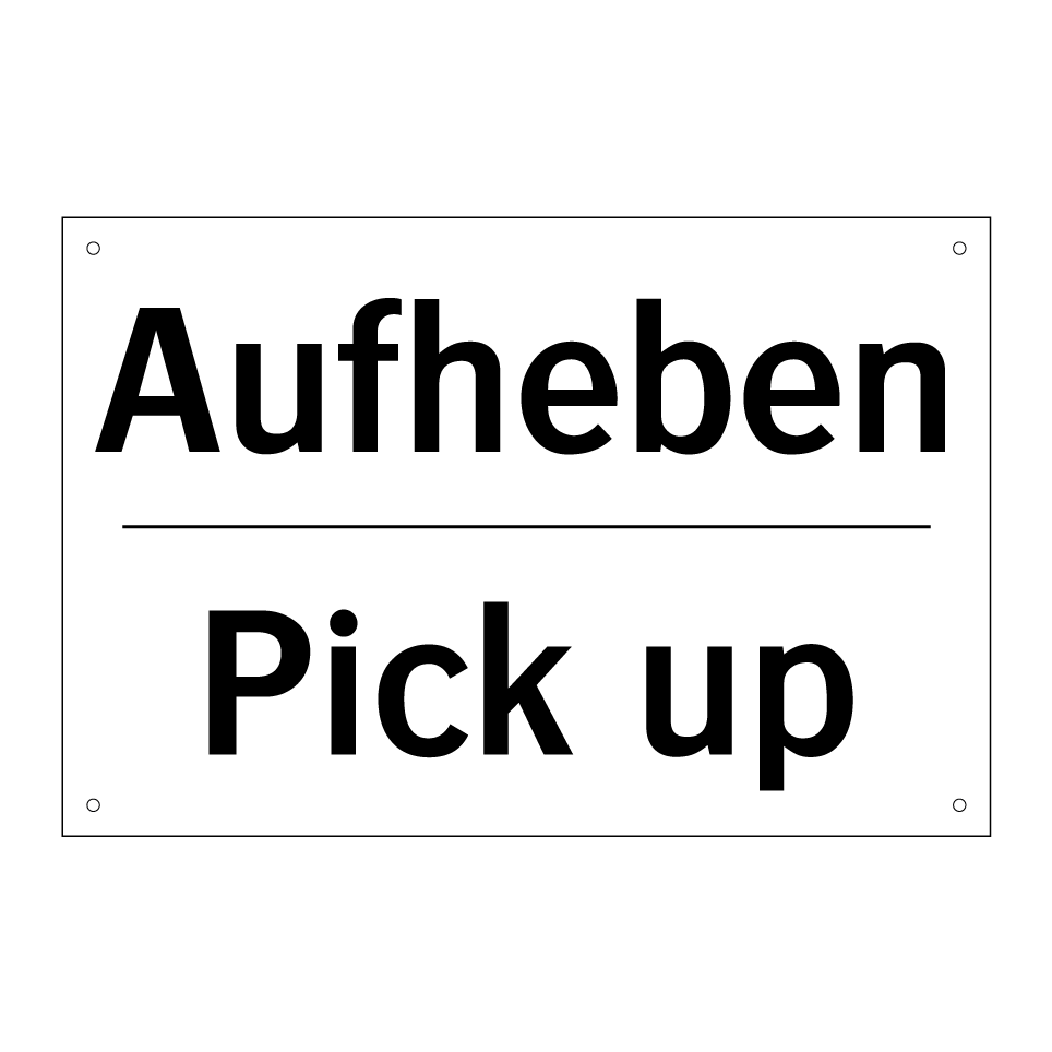 Zweisprachiges Verbotsschild mit deutschem Text Aufheben und englischem Text Pick up