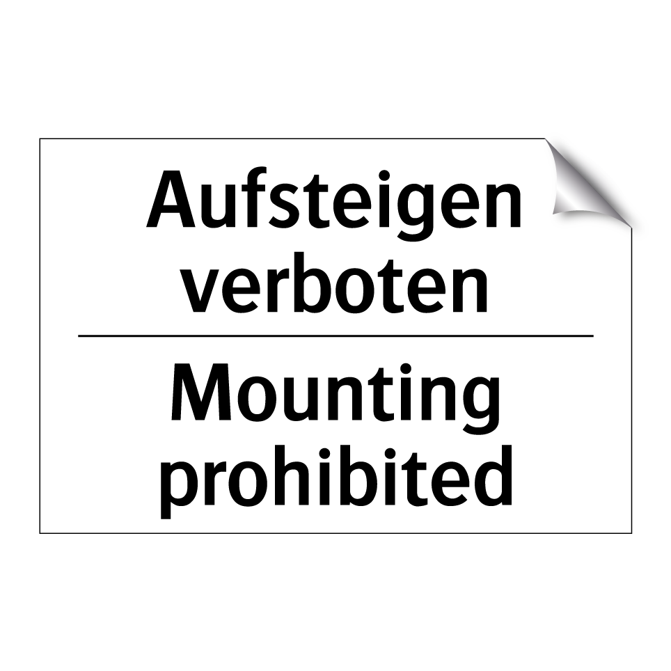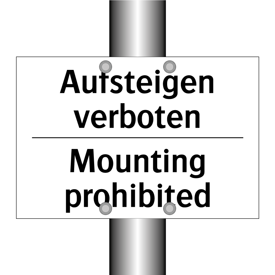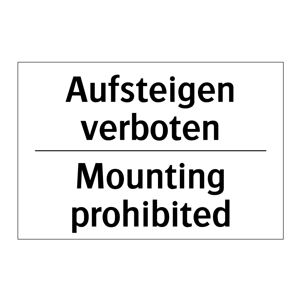 Zweisprachiges Verbotsschild mit deutschem Text Aufsteigen verboten und englischem Text Mounting prohibited