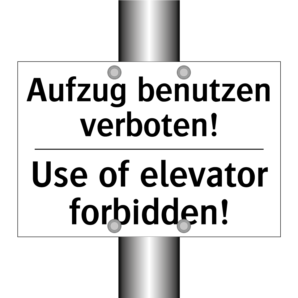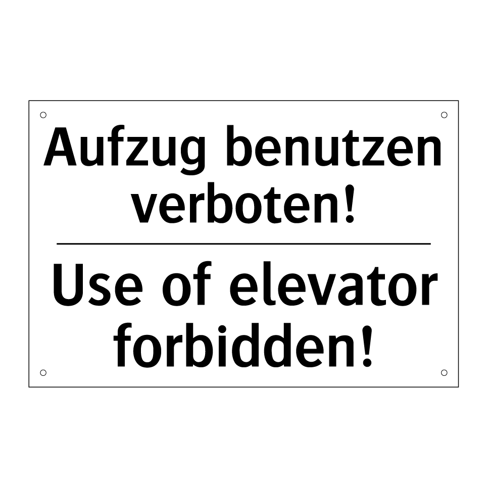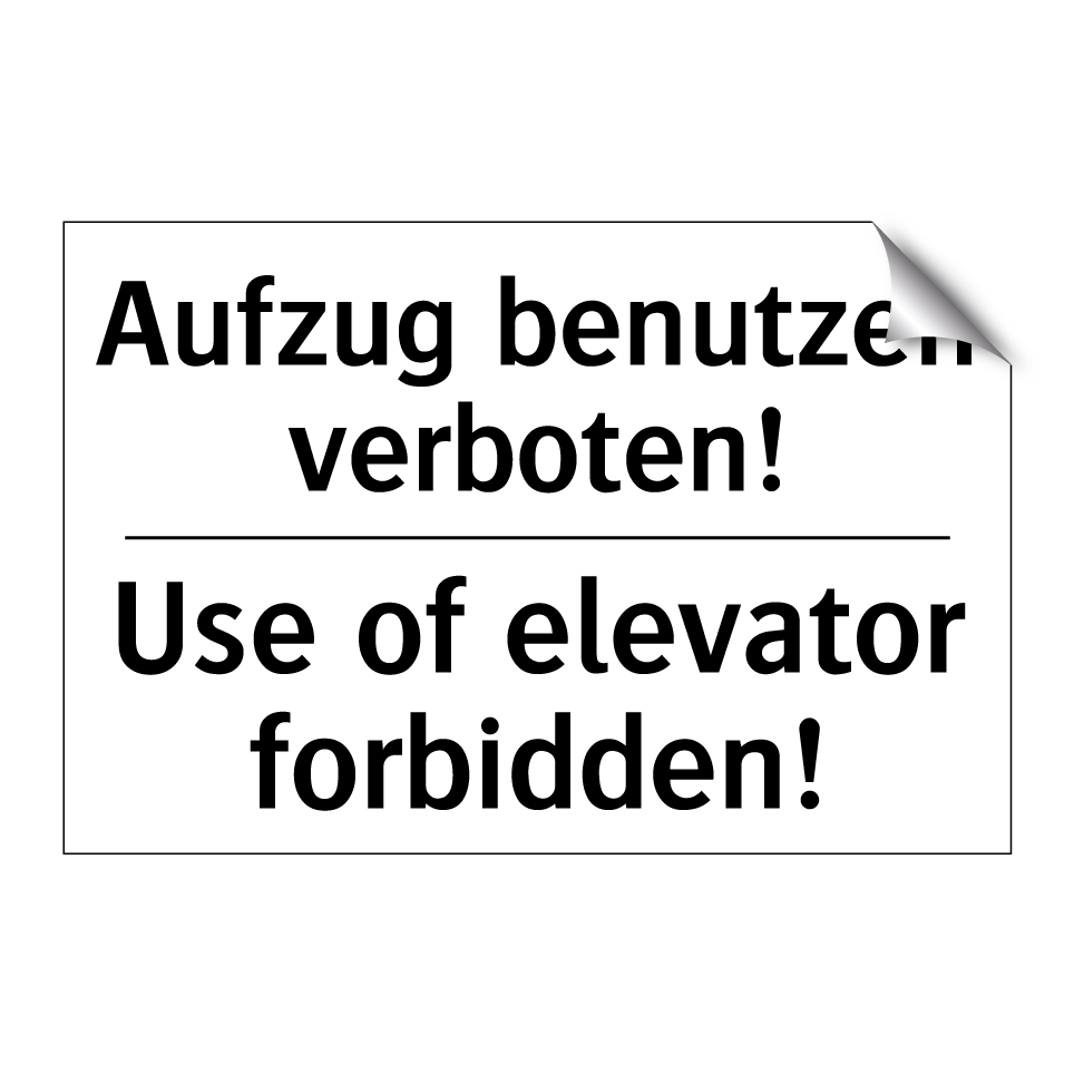 Zweisprachiges Verbotsschild mit deutschem Text Aufzug benutzen verboten! und englischem Text Use of elevator forbidden!