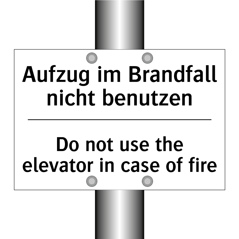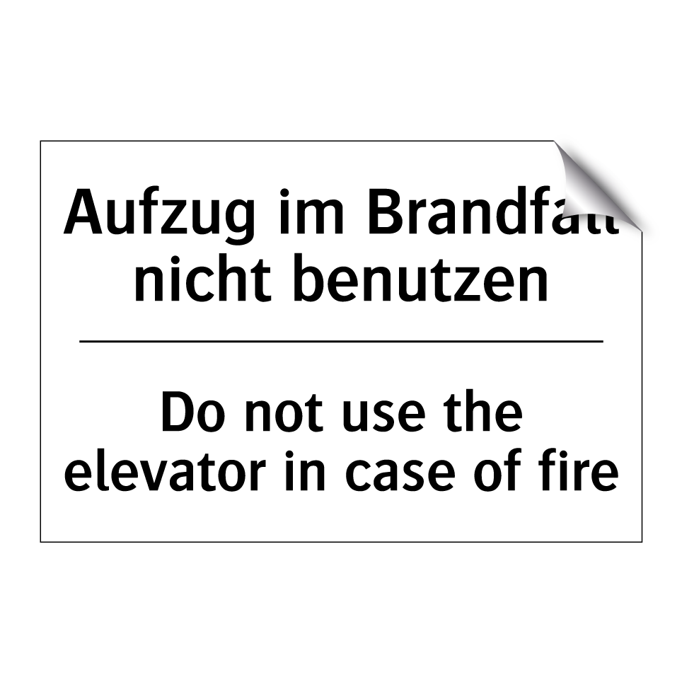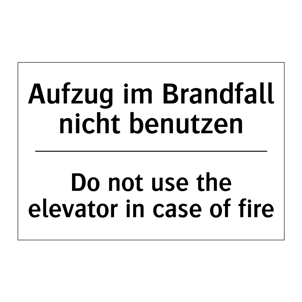 Zweisprachiges Verbotsschild mit deutschem Text Aufzug im Brandfall nicht benutzen und englischem Text Do not use the elevator in case of fire