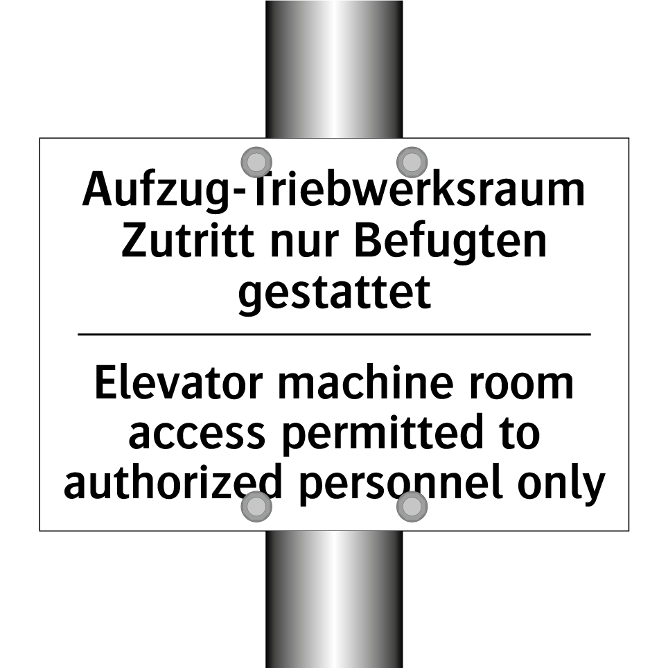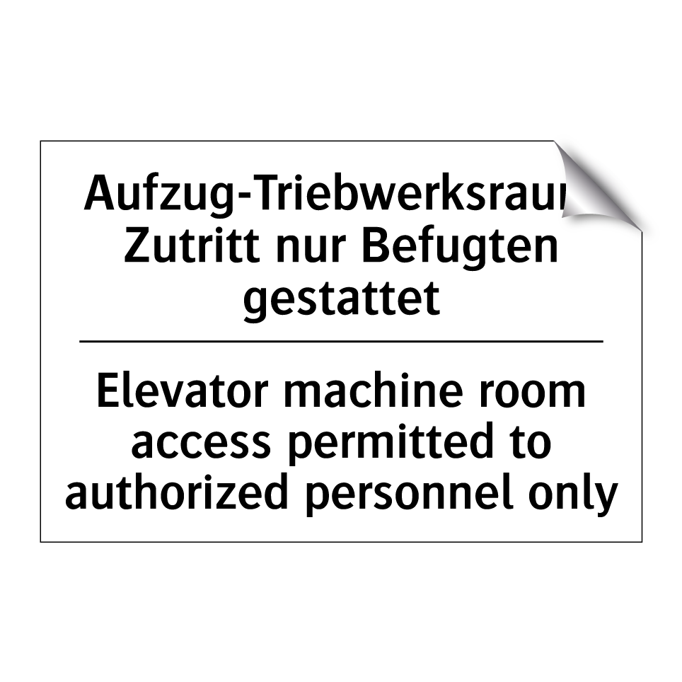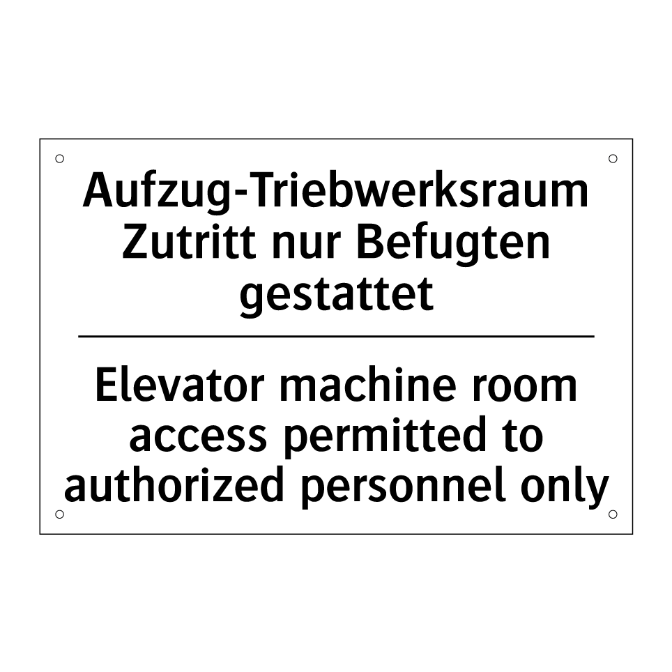 Zweisprachiges Verbotsschild mit deutschem Text Aufzug-Triebwerksraum Zutritt nur Befugten gestattet und englischem Text Elevator machine room access permitted to authorized personnel only