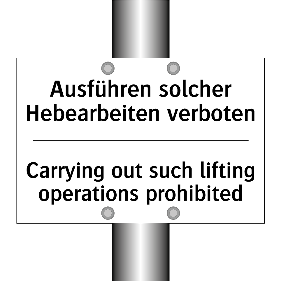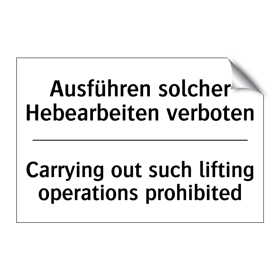 Zweisprachiges Verbotsschild mit deutschem Text Ausführen solcher Hebearbeiten verboten und englischem Text Carrying out such lifting operations prohibited