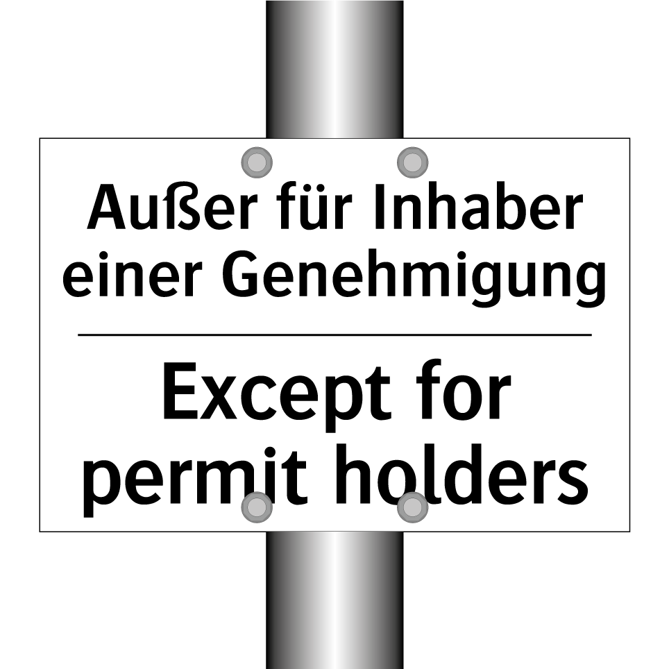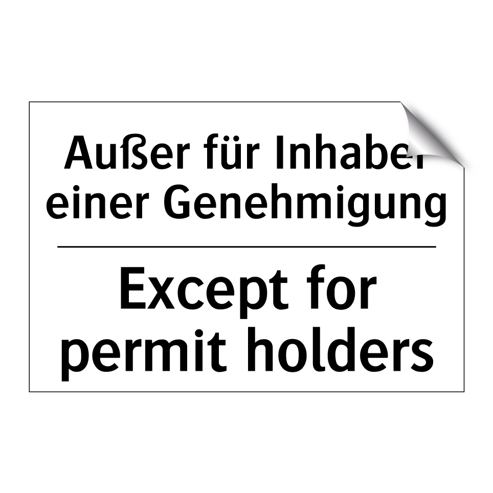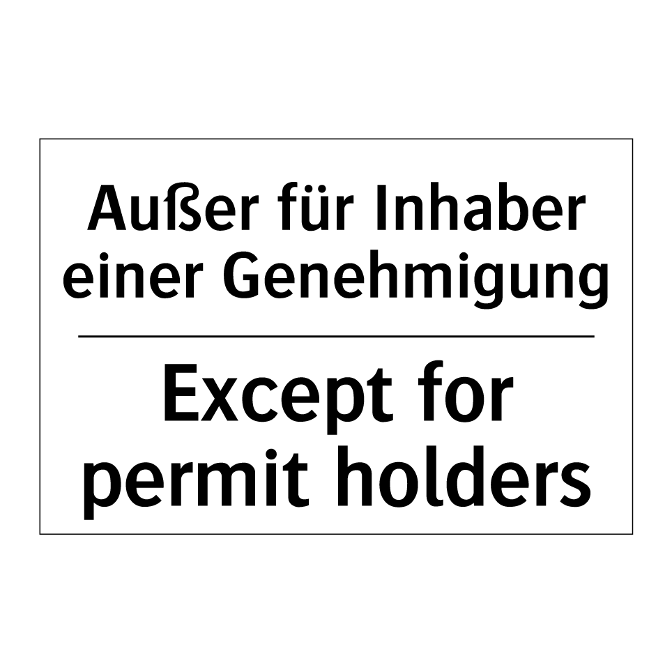 Zweisprachiges Verbotsschild mit deutschem Text Außer für Inhaber einer Genehmigung und englischem Text Except for permit holders