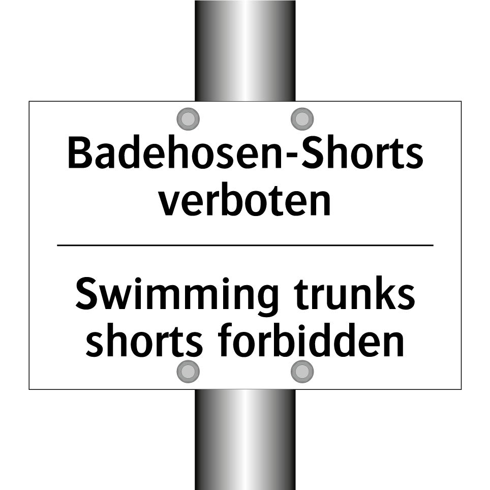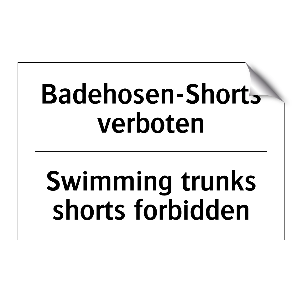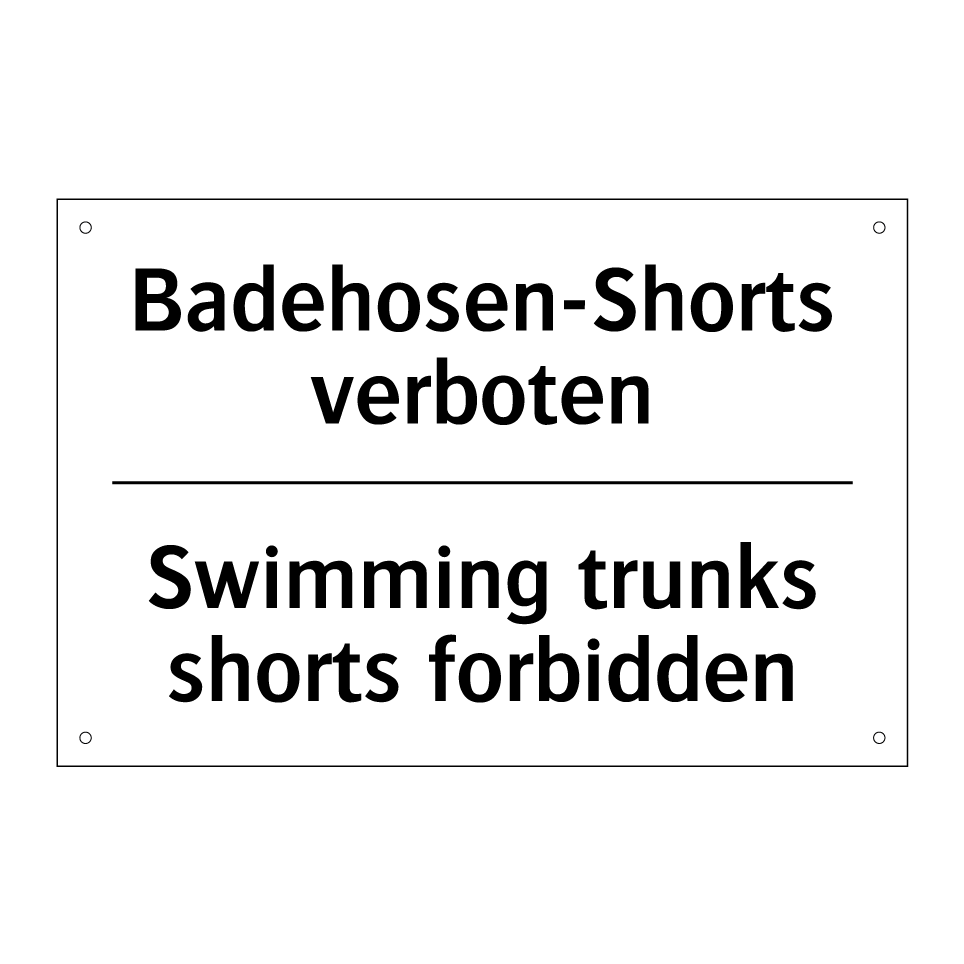 Zweisprachiges Verbotsschild mit deutschem Text Badehosen-Shorts verboten und englischem Text Swimming trunks shorts forbidden
