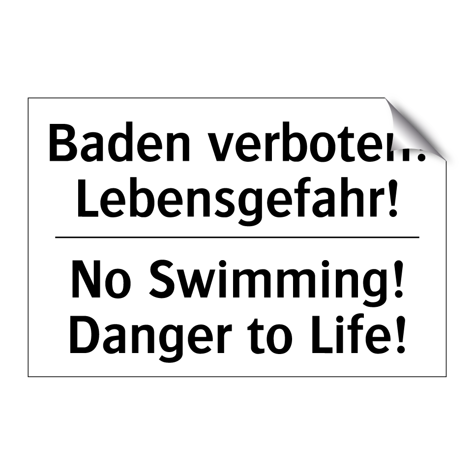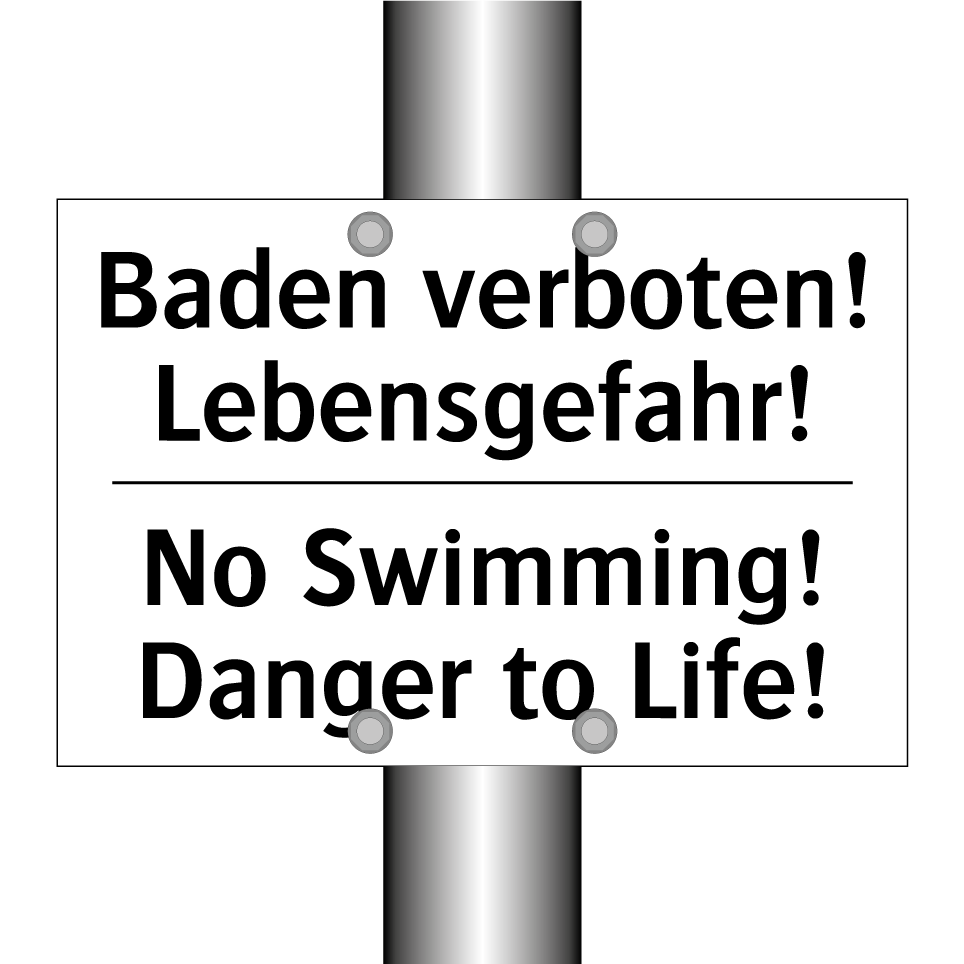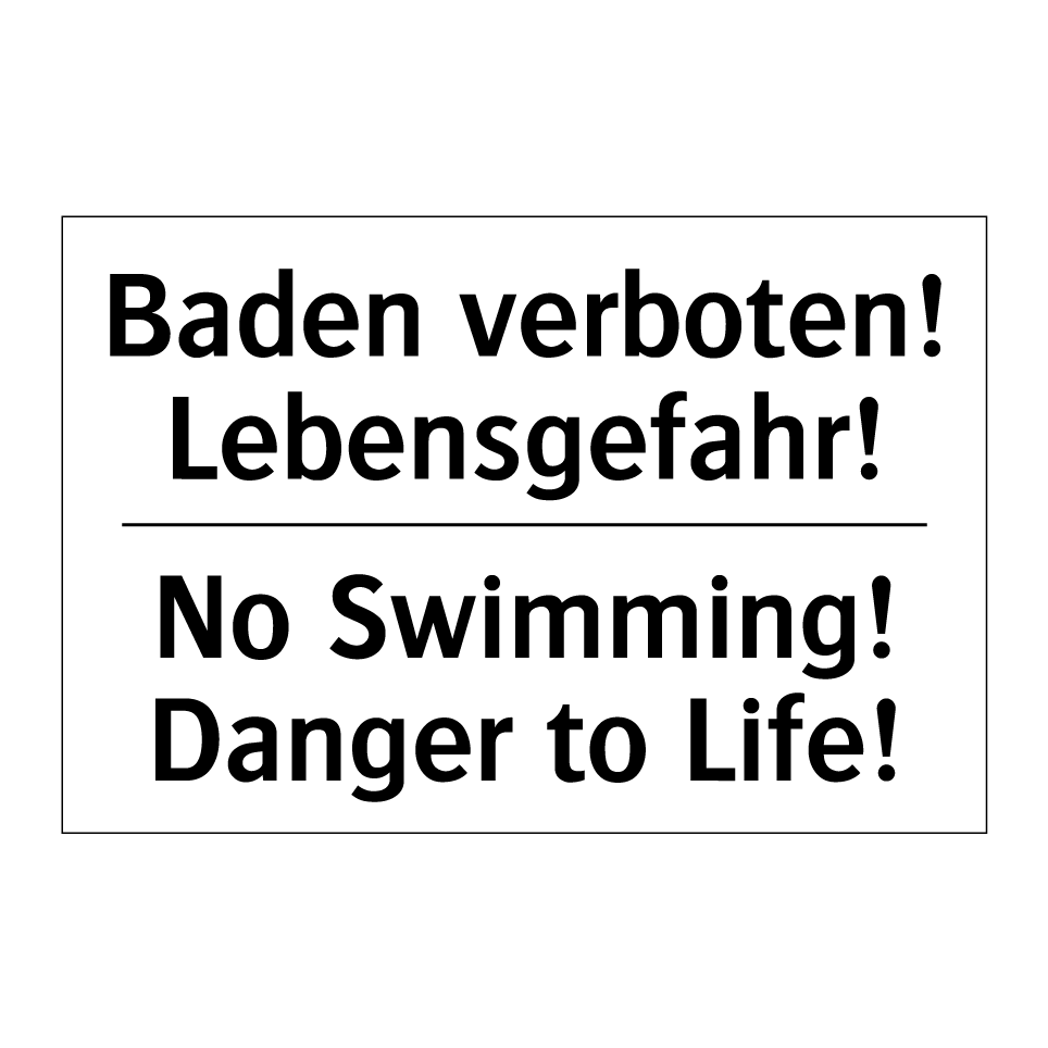 Zweisprachiges Verbotsschild mit deutschem Text Baden verboten! Lebensgefahr! und englischem Text No Swimming! Danger to Life!