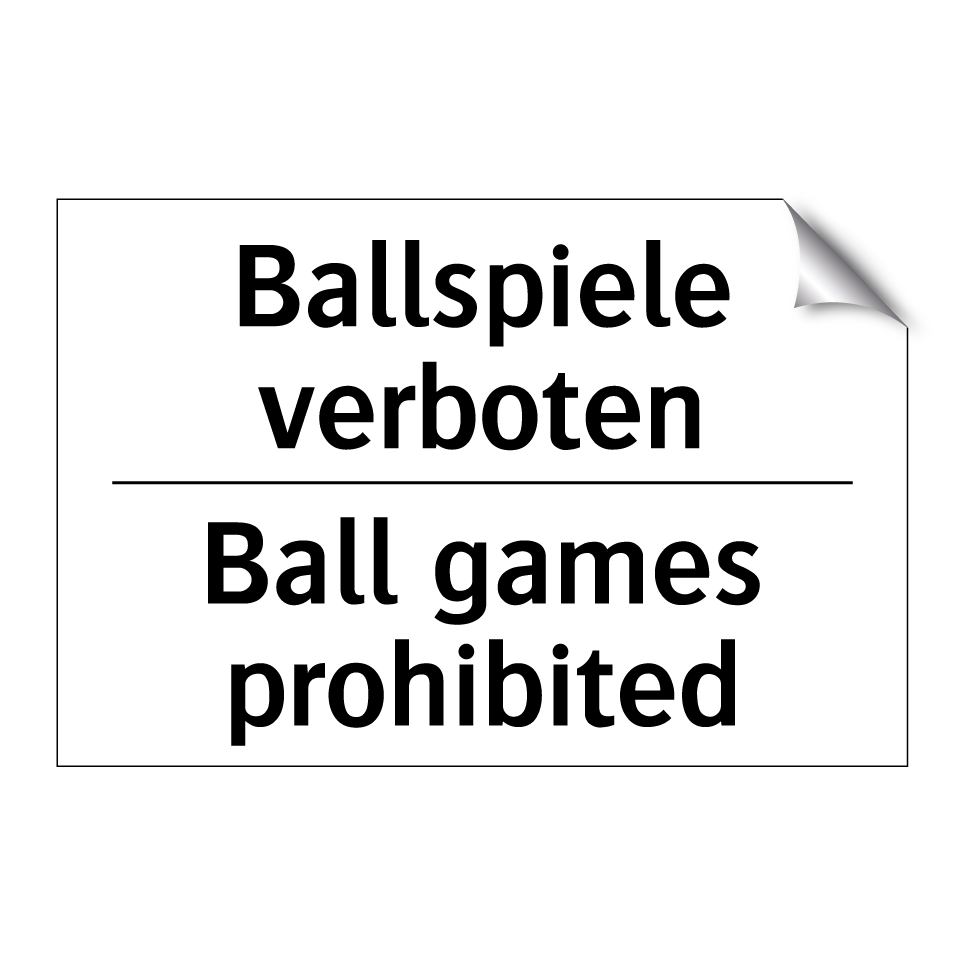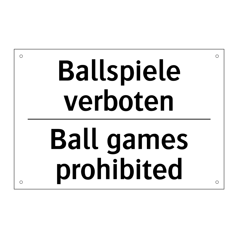 Zweisprachiges Verbotsschild mit deutschem Text Ballspiele verboten und englischem Text Ball games prohibited
