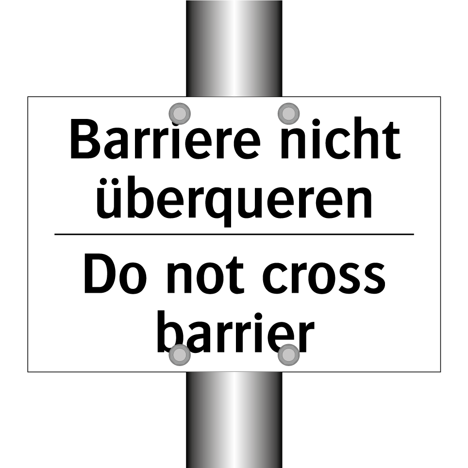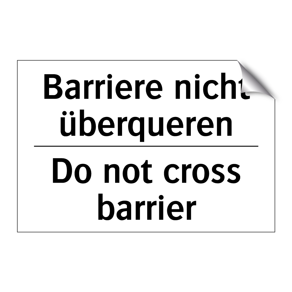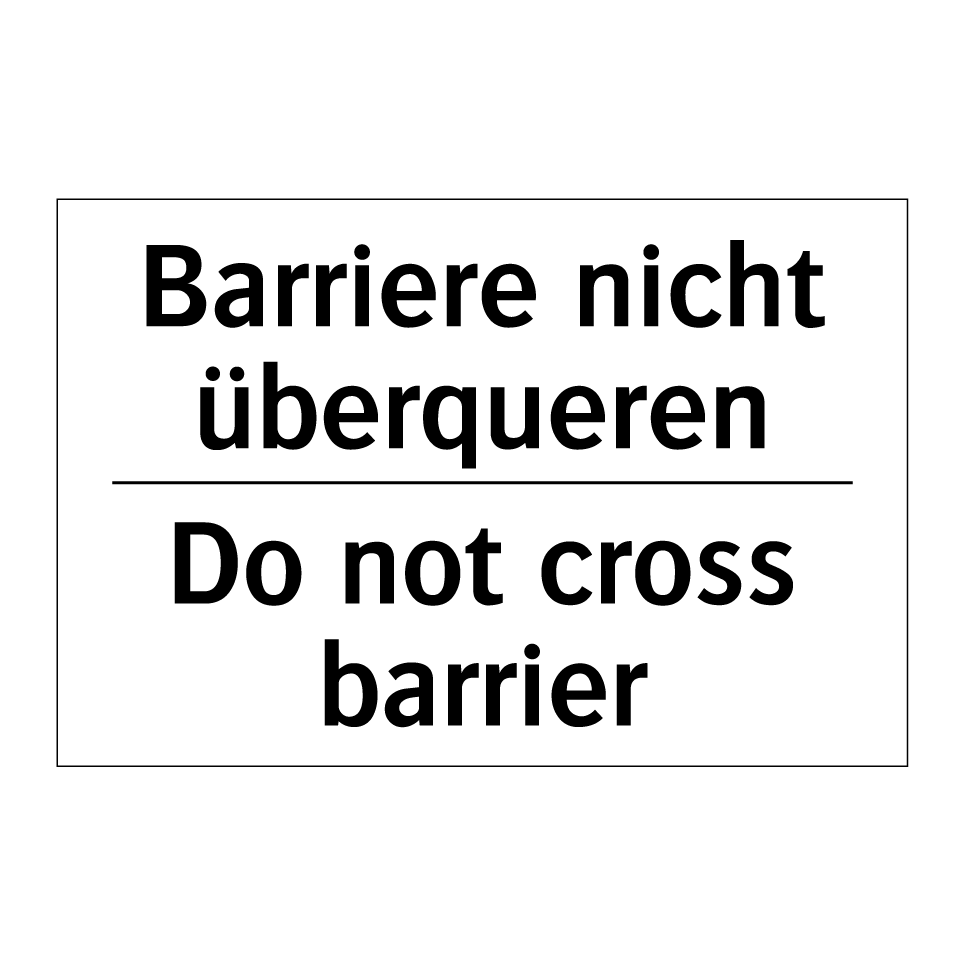 Zweisprachiges Verbotsschild mit deutschem Text Barriere nicht überqueren und englischem Text Do not cross barrier