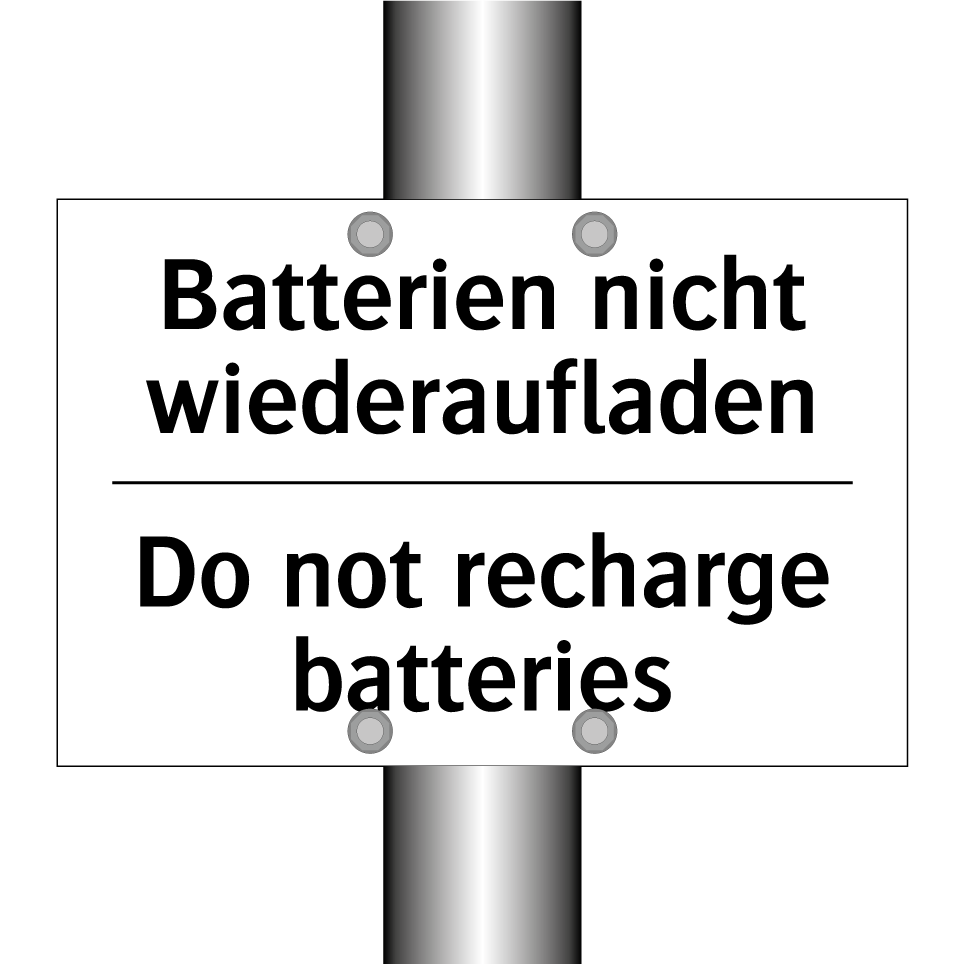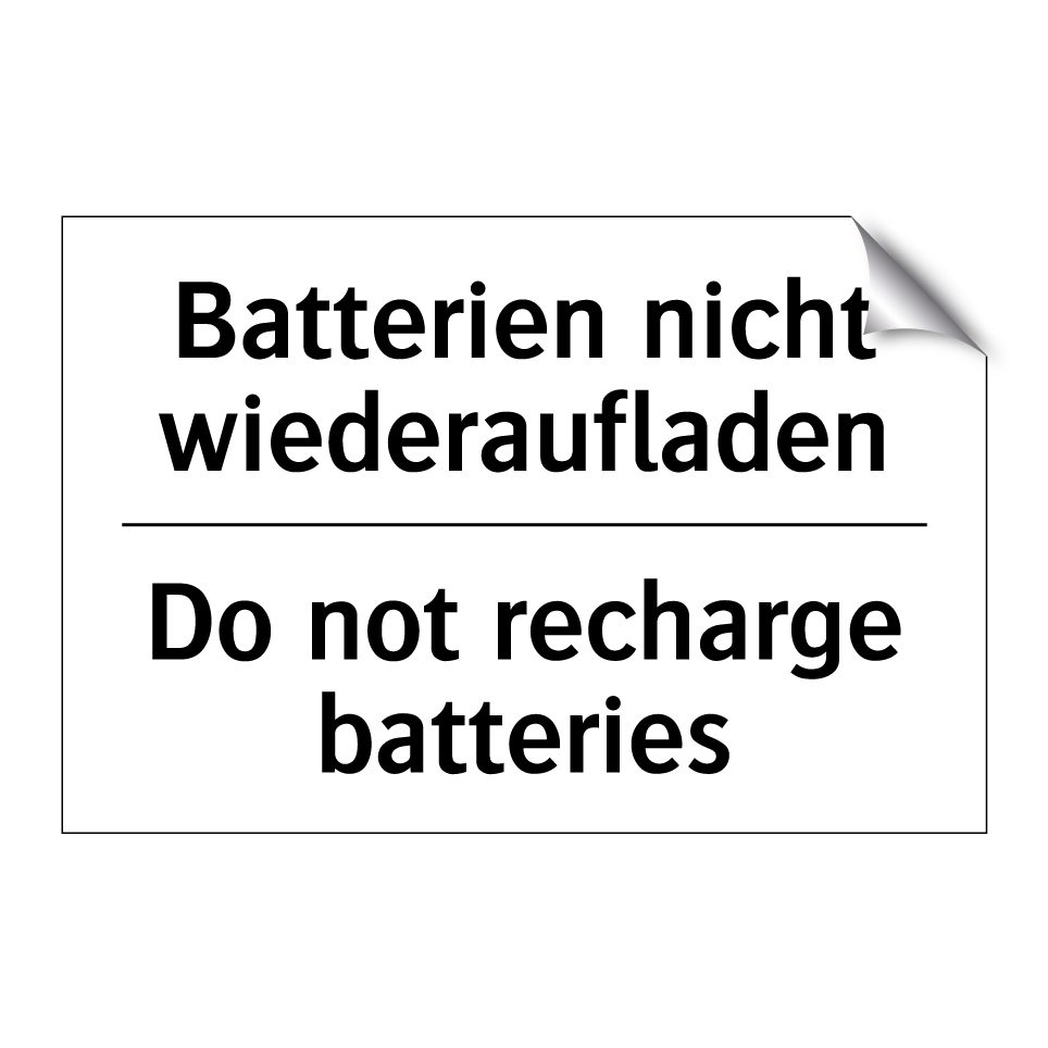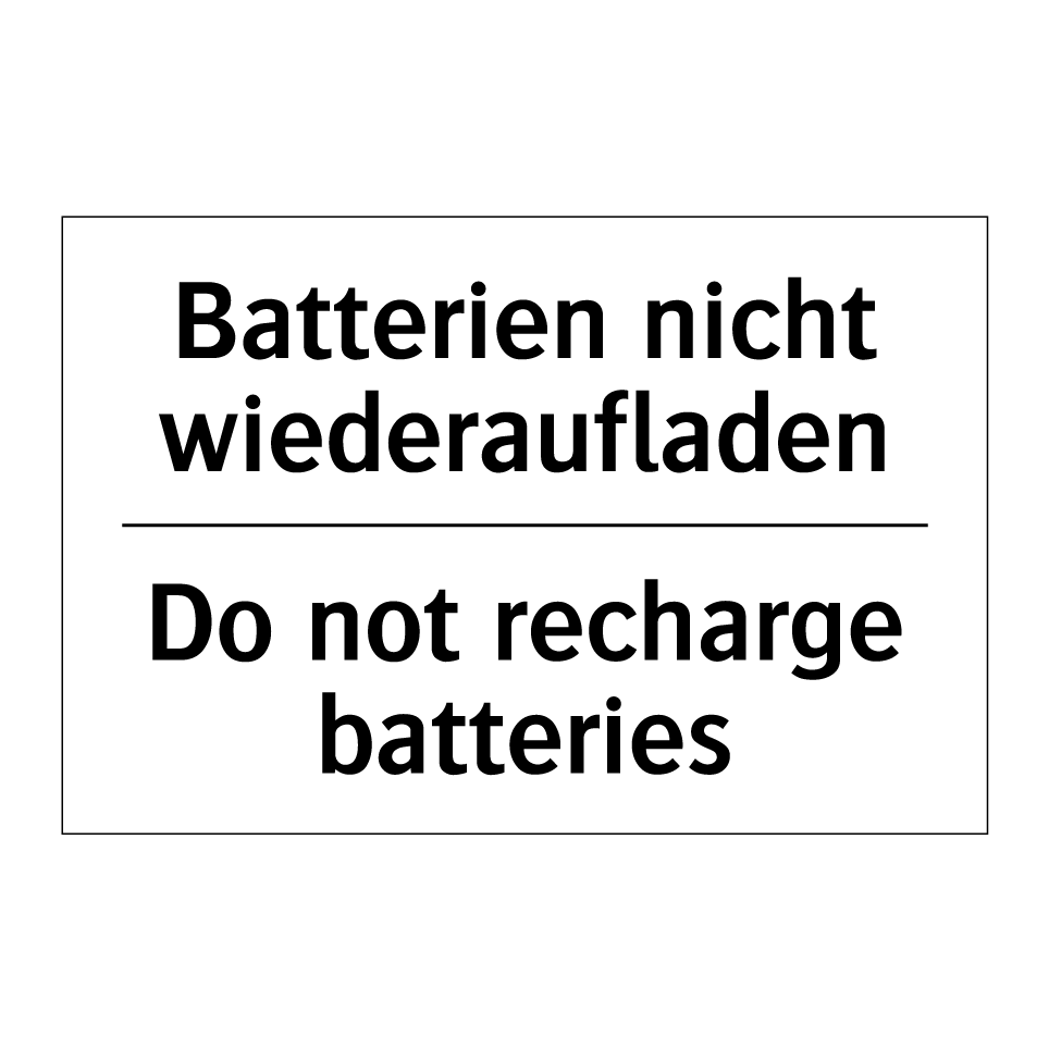 Zweisprachiges Verbotsschild mit deutschem Text Batterien nicht wiederaufladen und englischem Text Do not recharge batteries