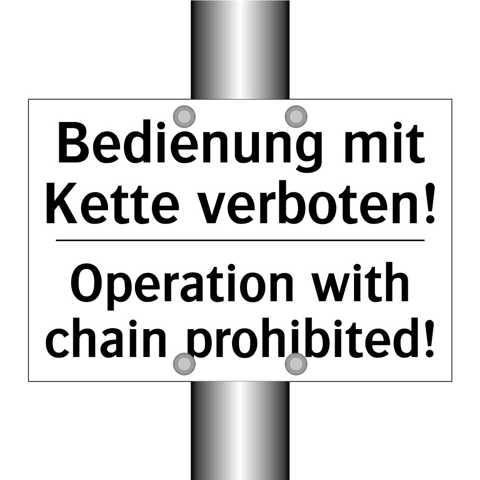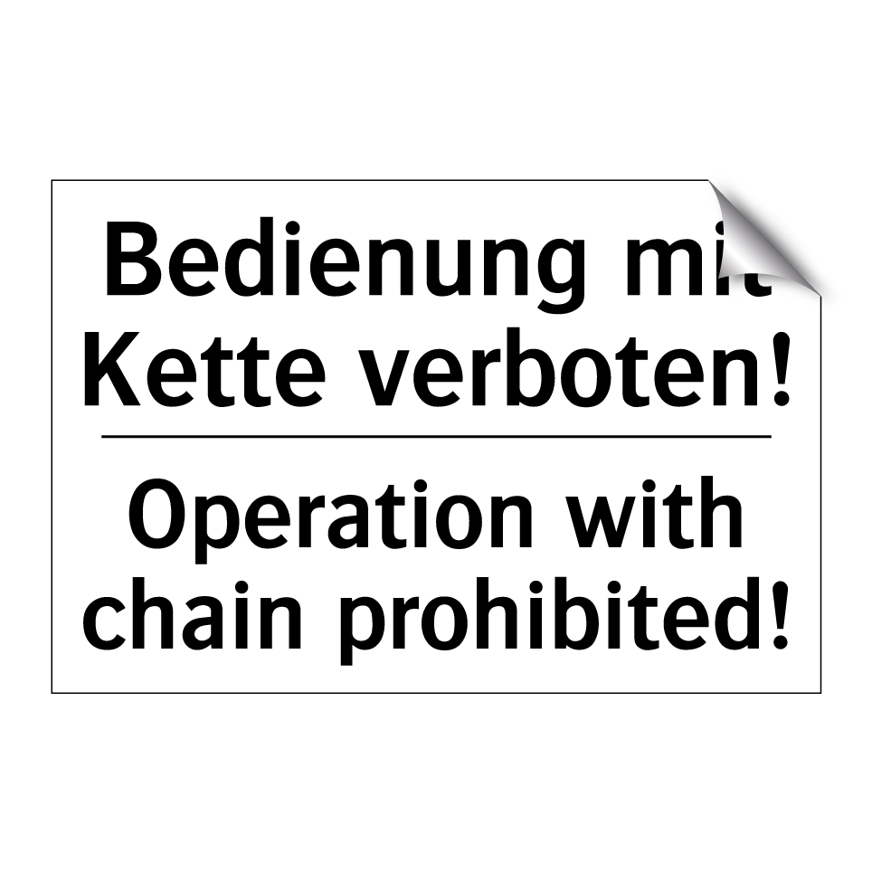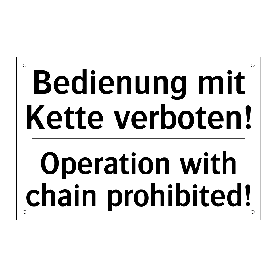 Zweisprachiges Verbotsschild mit deutschem Text Bedienung mit Kette verboten! und englischem Text Operation with chain prohibited!