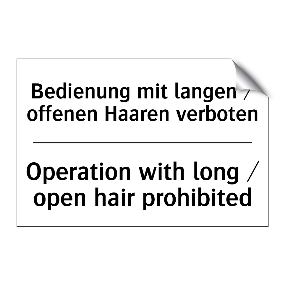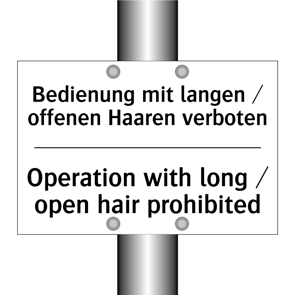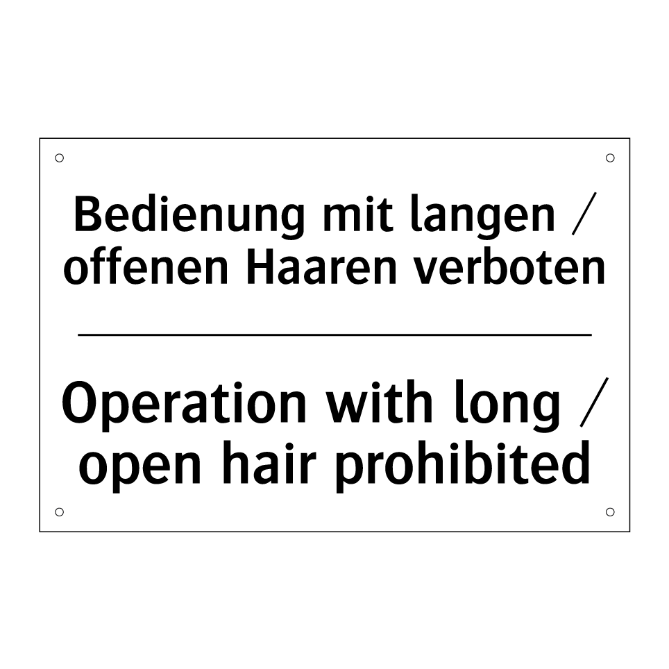 Zweisprachiges Verbotsschild mit deutschem Text Bedienung mit langen / offenen Haaren verboten und englischem Text Operation with long / open hair prohibited
