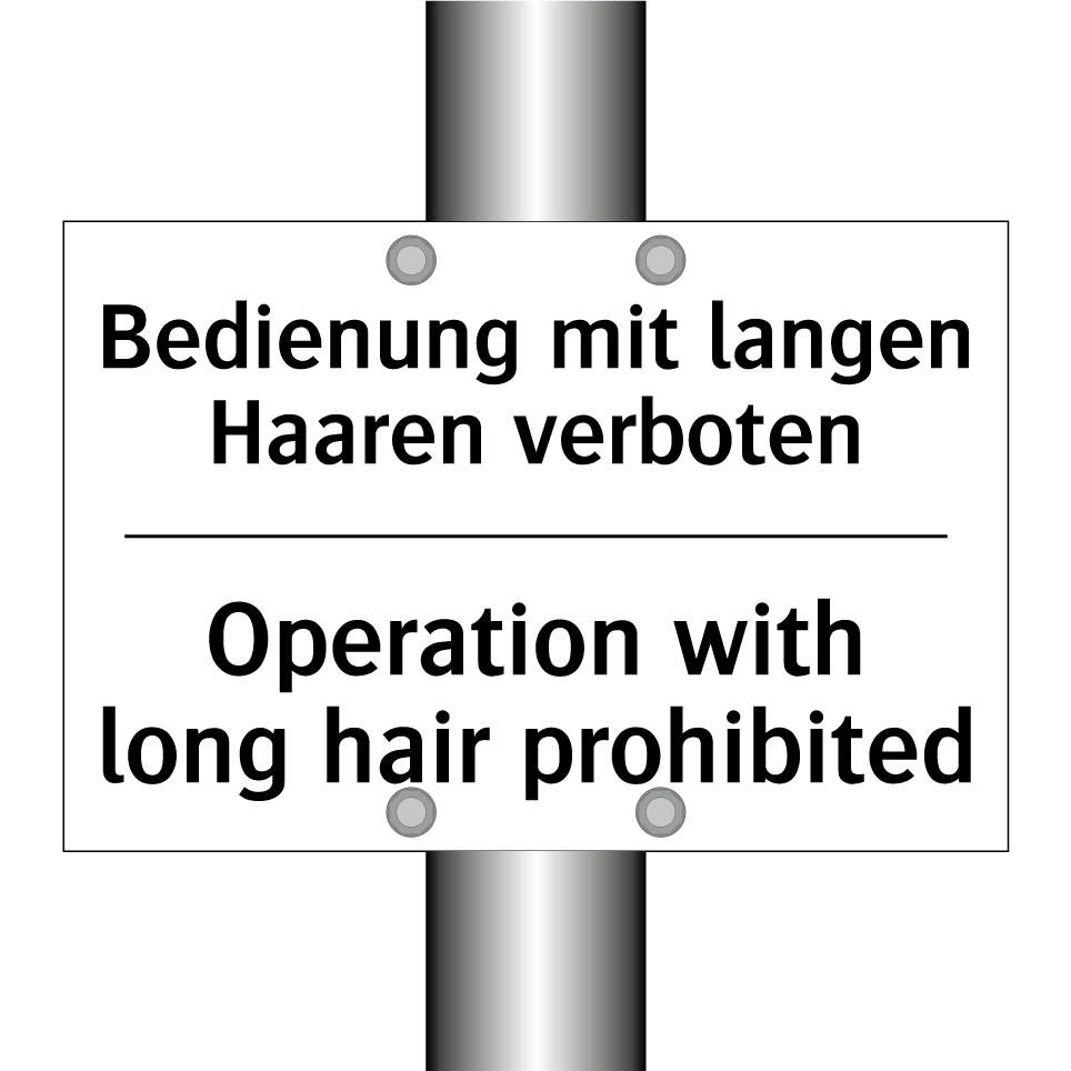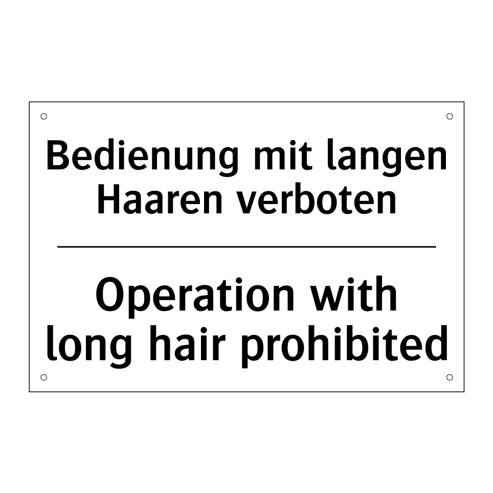Zweisprachiges Verbotsschild mit deutschem Text Bedienung mit langen Haaren verboten und englischem Text Operation with long hair prohibited